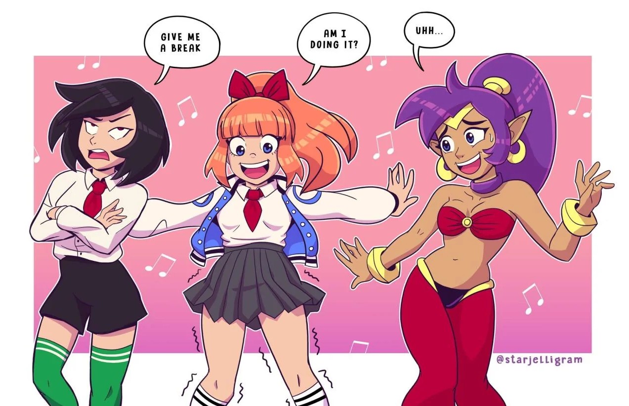 2girls black_hair blue_eyes bow bra breasts crossed_arms crossover dancing dark-skinned_female dark_skin english_text jacket kunio-kun_series kyoko_(kunio-kun) long_hair misako_(kunio-kun) multiple_girls musical_note necktie orange_hair pants pointy_ears ponytail purple_hair red_bow river_city_girls school_uniform shantae shantae_(series) short_hair shorts skirt starjelligram underwear very_long_hair