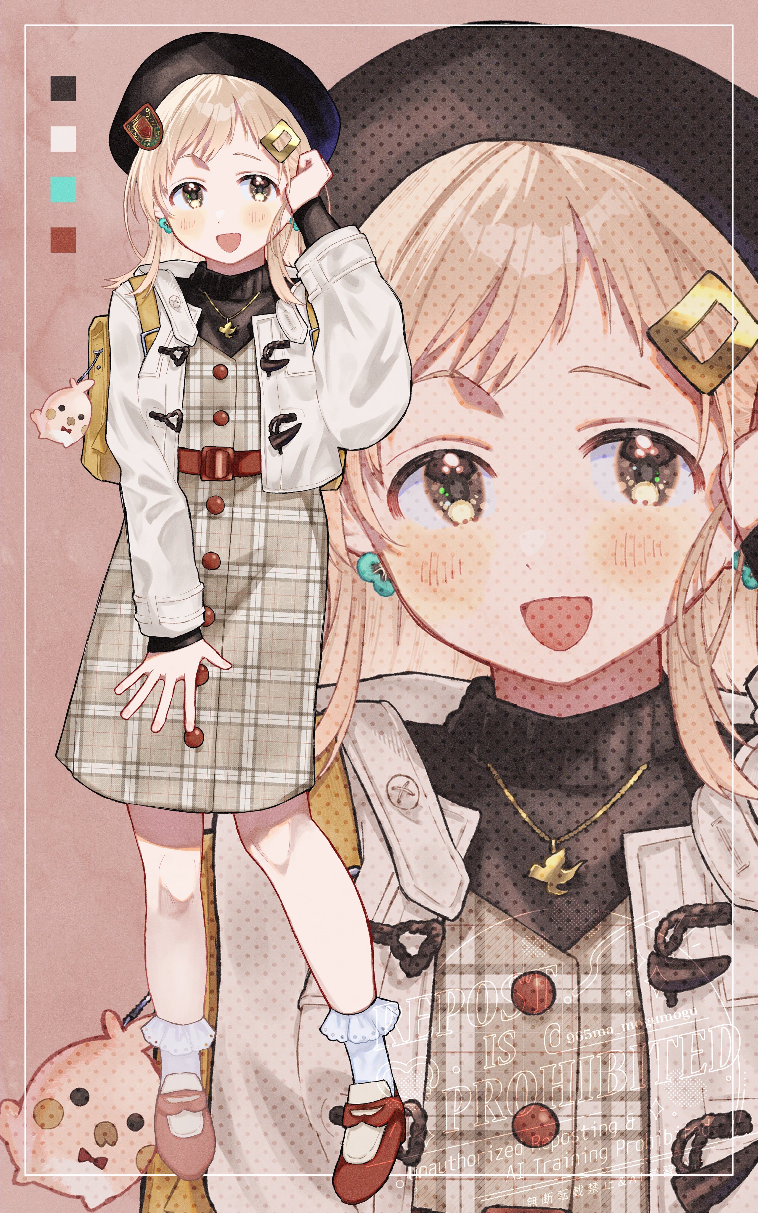 965ma_mogumogu :d absurdres backpack bag beret black_hat black_shirt blonde_hair blush brown_dress brown_eyes clenched_hand color_guide cropped_jacket dot_nose dress facing_viewer frilled_socks frills full_body hair_ornament hairclip hand_up hat highres idolmaster idolmaster_shiny_colors jacket jewelry legs_apart long_sleeves looking_to_the_side medium_dress medium_hair necklace open_clothes open_jacket open_mouth pink_background plaid_clothes plaid_dress red_shoes sakuragi_mano shirt shoes smile socks spread_fingers standing straight_hair white_jacket yellow_bag zoom_layer
