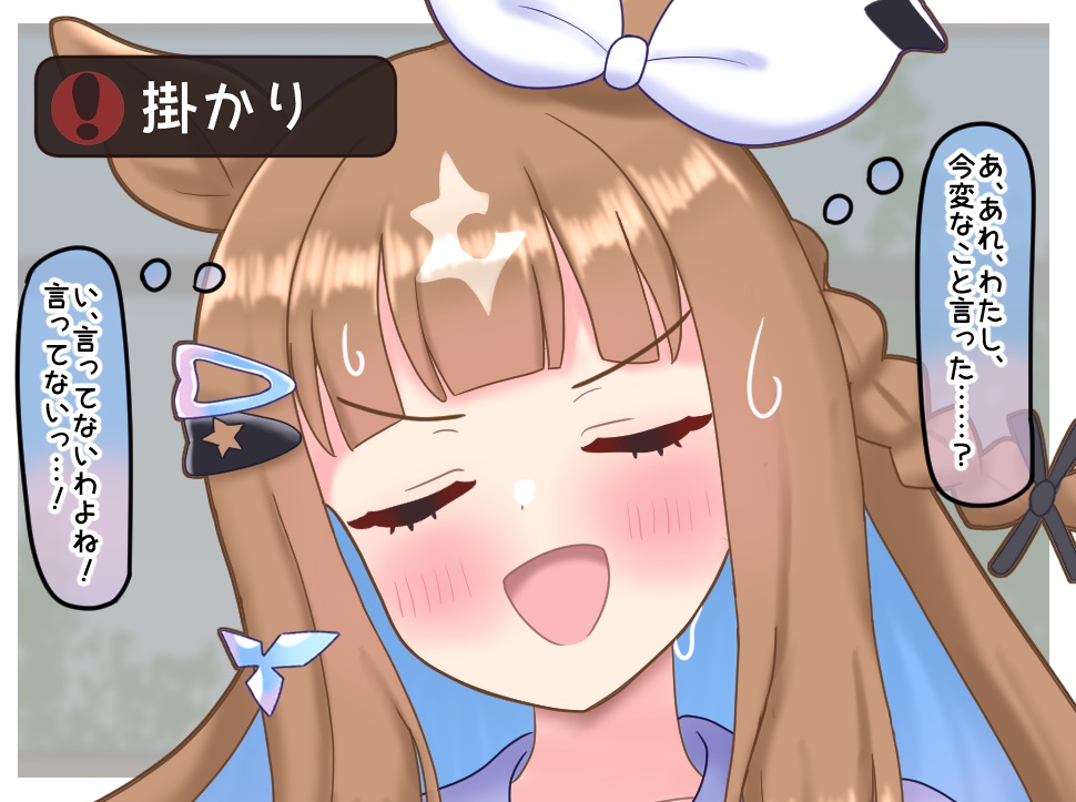 1girl almond_eye_(umamusume) animal_ears blush brown_hair closed_eyes collarbone commentary_request hair_between_eyes hair_ornament hairclip horse_ears horse_girl marriage_proposal multicolored_hair peruninjin portrait simple_background solo sweatdrop translation_request two-tone_hair umamusume