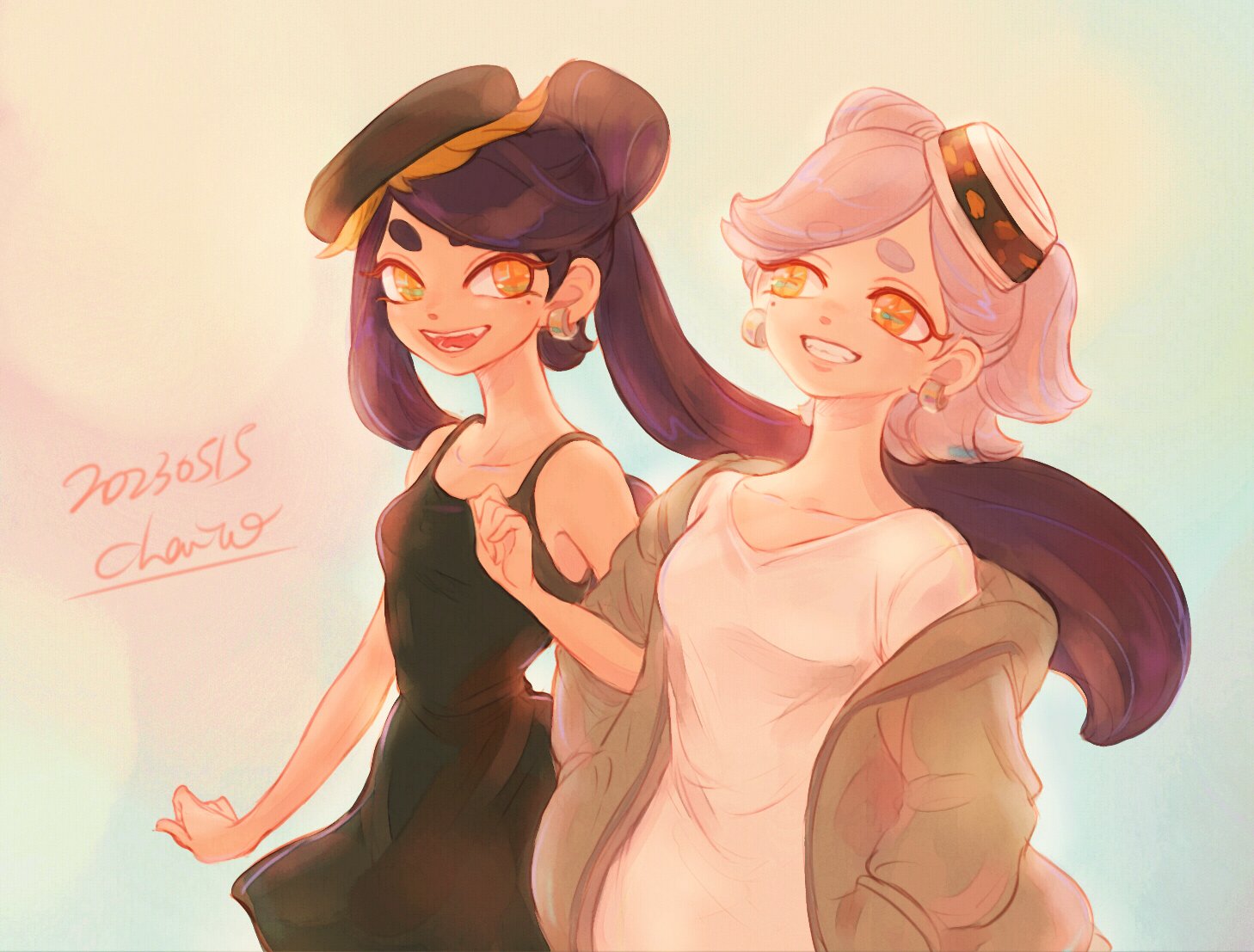 +_+ 2girls black_hair callie_(splatoon) casual chai_5 earrings fangs food food_on_head humanization jewelry long_hair looking_at_viewer marie_(splatoon) mole mole_under_eye multiple_girls nintendo object_on_head open_mouth short_hair smile splatoon_(series)