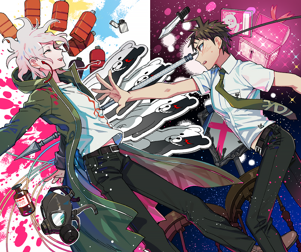 2boys ahoge black_pants blush box brown_hair brown_shoes colorful_background danganronpa_(series) danganronpa_2:_goodbye_despair feet_out_of_frame gas_mask green_jacket green_necktie grey_hair hinata_hajime hood hood_down hooded_jacket jacket knife komaeda_nagito male_focus mask messy_hair monokuma multiple_boys necktie open_clothes open_jacket pants polearm print_shirt profile shirt shoes short_hair short_sleeves smile spear uurin weapon white_background white_shirt