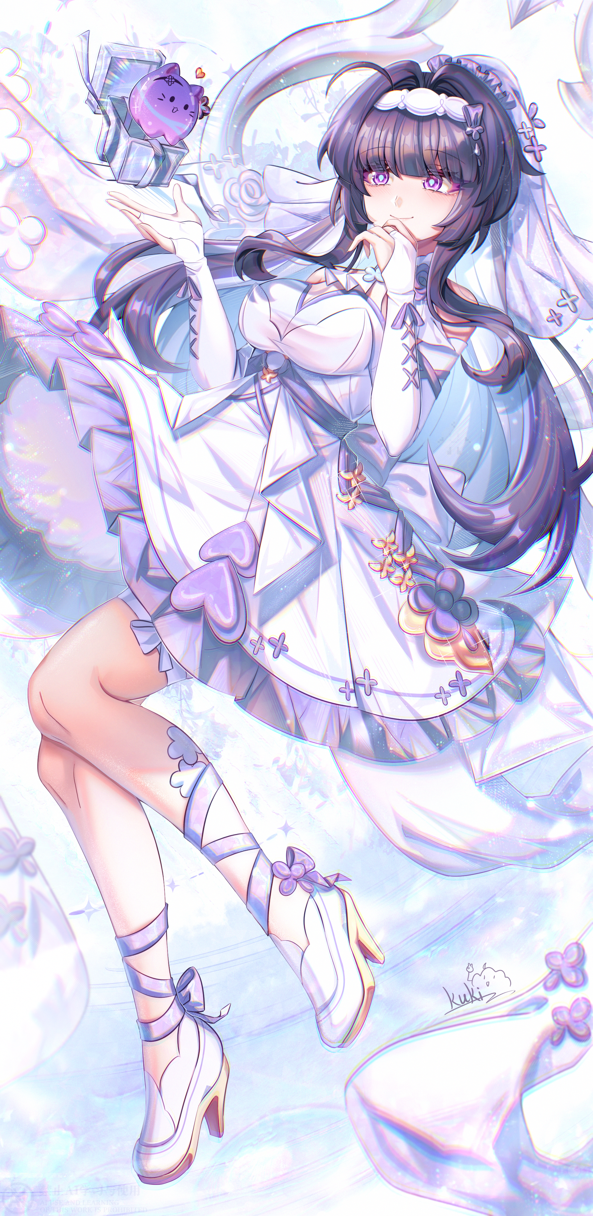 1girl absurdres birthday blue_pupils box bridal_gauntlets chinese_commentary closed_mouth commentary cutescookie dress full_body gift gift_box hand_on_own_chin high_heels highres honkai_(series) honkai_impact_3rd long_hair purple_eyes purple_hair raiden_mei shoes signature smile solo white_dress white_shoes