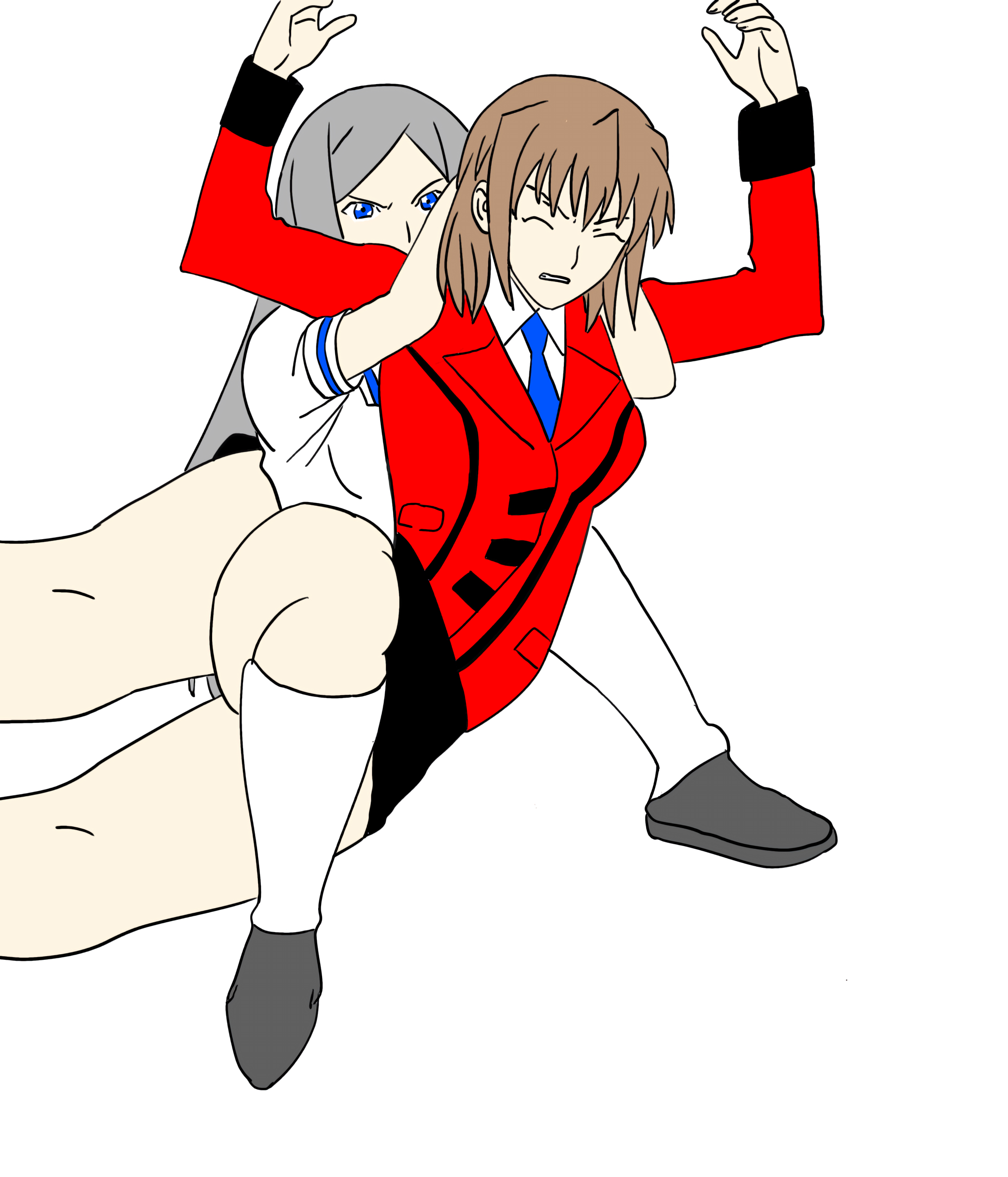 absurdres agent_aika aika_(series) aika_r-16 blue_eyes brown_hair dress full_nelson highres kneehighs necktie sailor_dress shoes skirt socks submission_hold tagme white_delmo white_hair wrestling
