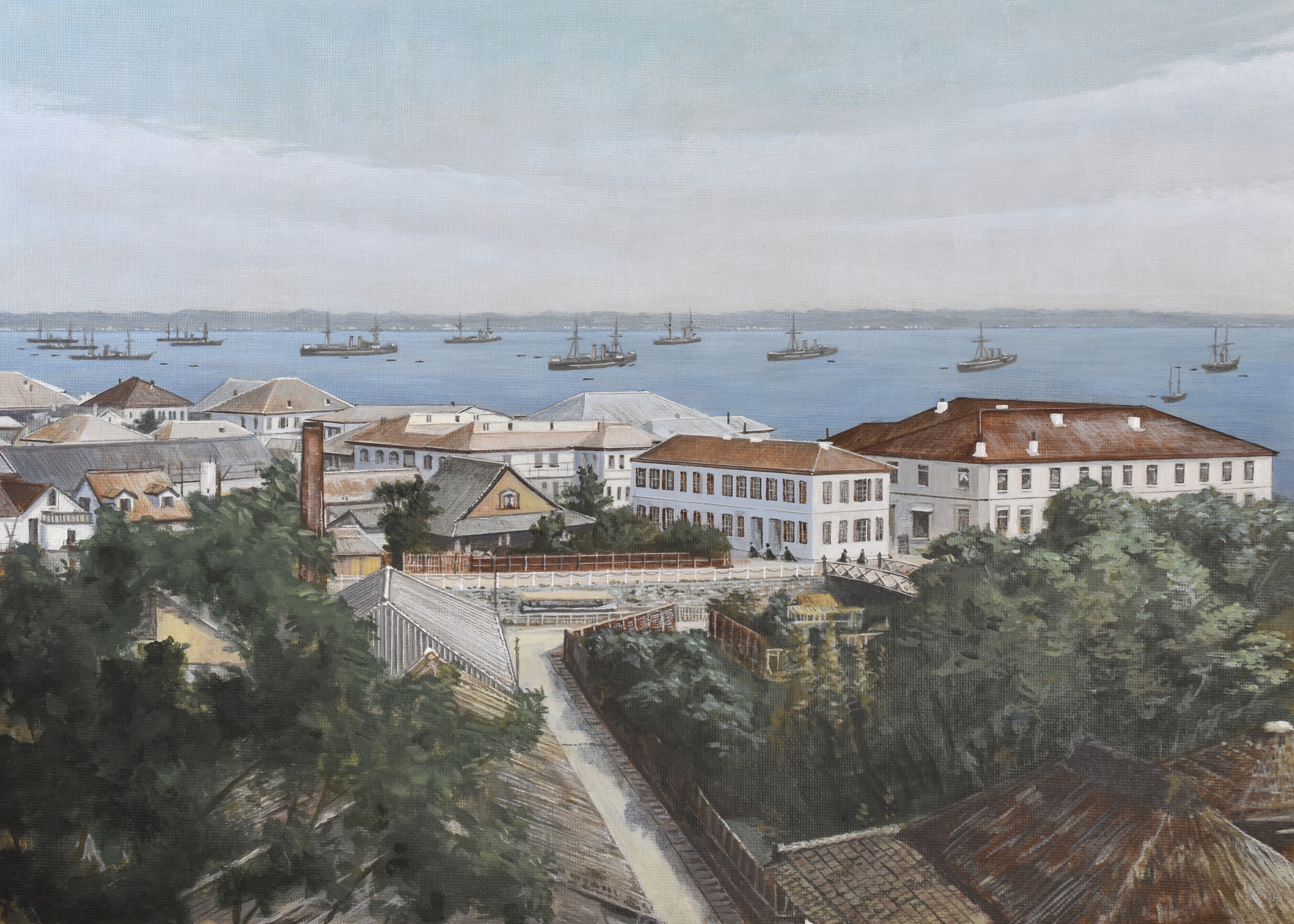 absurdres acrylic_paint_(medium) atelier_bono building fence highres historical_event imperial_chinese_navy japan ocean original painting_(medium) port road scenery sky smokestack traditional_media tree yokohama