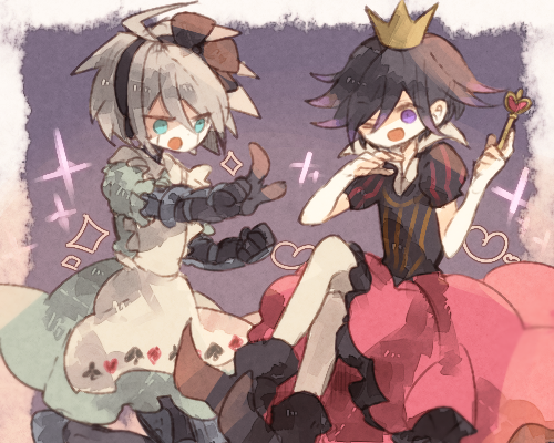 2boys ahoge alice's_adventures_in_wonderland alice_(alice_in_wonderland) alice_(alice_in_wonderland)_(cosplay) android apron aqua_eyes black_boots black_bow black_dress black_hair black_hairband blue_dress boots border bow clenched_hand clover collared_dress collared_shirt colored_tips cosplay crossdressing crossdressing_(mtf) crossed_legs crown danganronpa_(series) danganronpa_v3:_killing_harmony diamond_(shape) dress feet_out_of_frame frilled_apron frilled_sleeves frills full_body gold_crown grey_hair hair_between_eyes hair_bow hairband happy heart heart_print heart_wand high_collar holding holding_wand k1-b0 lowres male_focus medium_dress multicolored_hair multiple_boys oma_kokichi one_eye_closed open_mouth outside_border pleated_dress pointing pointing_at_another pointy_boots puffy_short_sleeves puffy_sleeves purple_background purple_eyes purple_hair queen_of_hearts_(alice_in_wonderland) queen_of_hearts_(alice_in_wonderland)_(cosplay) red_dress shirt short_hair short_sleeves sitting smile spade_(shape) sparkle spiked_hair striped_clothes striped_dress toskogahazan two-tone_dress vertical-striped_clothes vertical-striped_dress wand white_apron white_border white_shirt