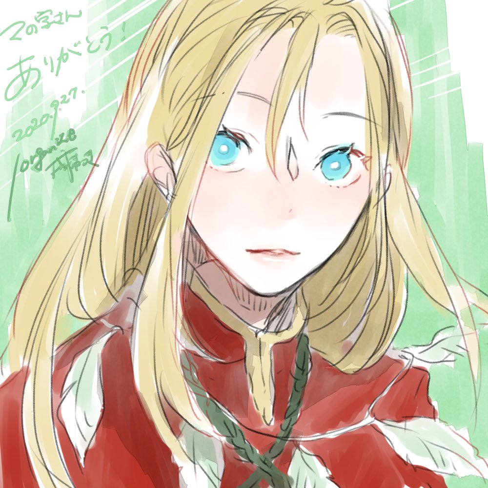 1boy ahat_(ragnarok_online) bishounen blonde_hair blue_eyes commentary_request dated expressionless green_background long_hair looking_at_viewer male_focus parted_lips ragnarok_online red_shirt shirt solo upper_body yutsuki