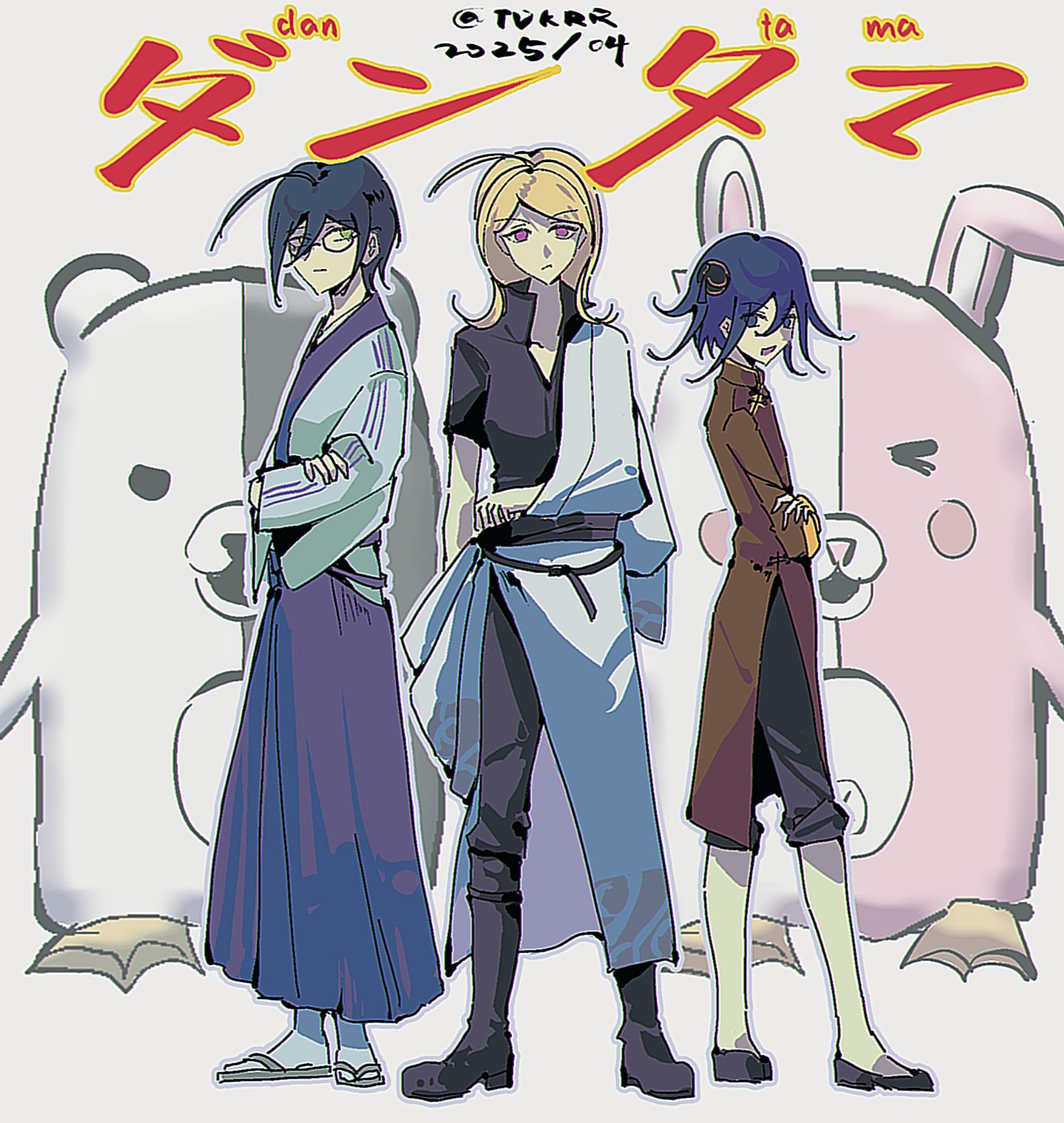 1girl 2025 2boys ahoge akamatsu_kaede black_hair blonde_hair chinese_clothes commentary cosplay crossed_arms danganronpa_(series) danganronpa_v3:_killing_harmony dated flipped_hair full_body gintama glasses hair_between_eyes hair_ornament height_difference highres japanese_clothes kagura_(gintama) kagura_(gintama)_(cosplay) kimono long_hair long_sleeves looking_at_viewer medium_hair monokuma multiple_boys oma_kokichi open_clothes open_kimono open_mouth pants parody pink_eyes purple_eyes purple_hair saihara_shuichi sakata_gintoki sakata_gintoki_(cosplay) sandals shimura_shinpachi shimura_shinpachi_(cosplay) shirt short_hair short_sleeves standing tadokorori_(tdkrr) usami_(danganronpa) yellow_eyes