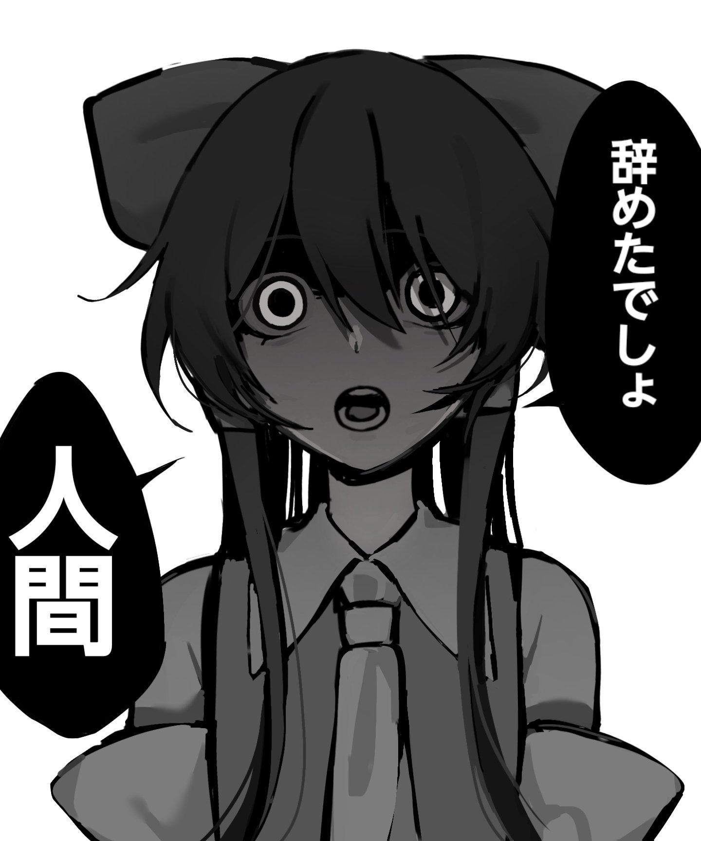 1girl ascot bare_shoulders bow detached_sleeves frilled_bow frilled_hair_tubes frills hair_bow hair_tubes hakurei_reimu highres impending_doom long_hair looking_at_viewer monochrome rwft3bpgzzqk634 serious simple_background solo touhou translated upper_body white_background