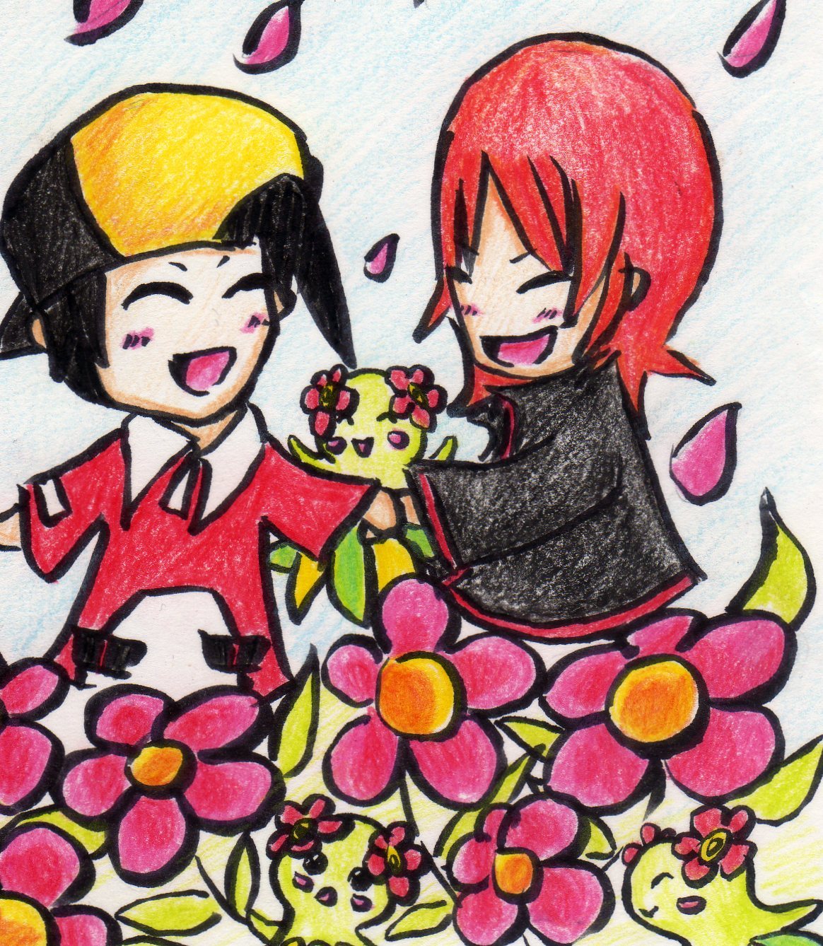 2boys bellossom ethan_(pokemon) flower gen_2_pokemon highres multiple_boys nintendo pokemon pokemon_gold/silver/crystal silver_(pokemon)