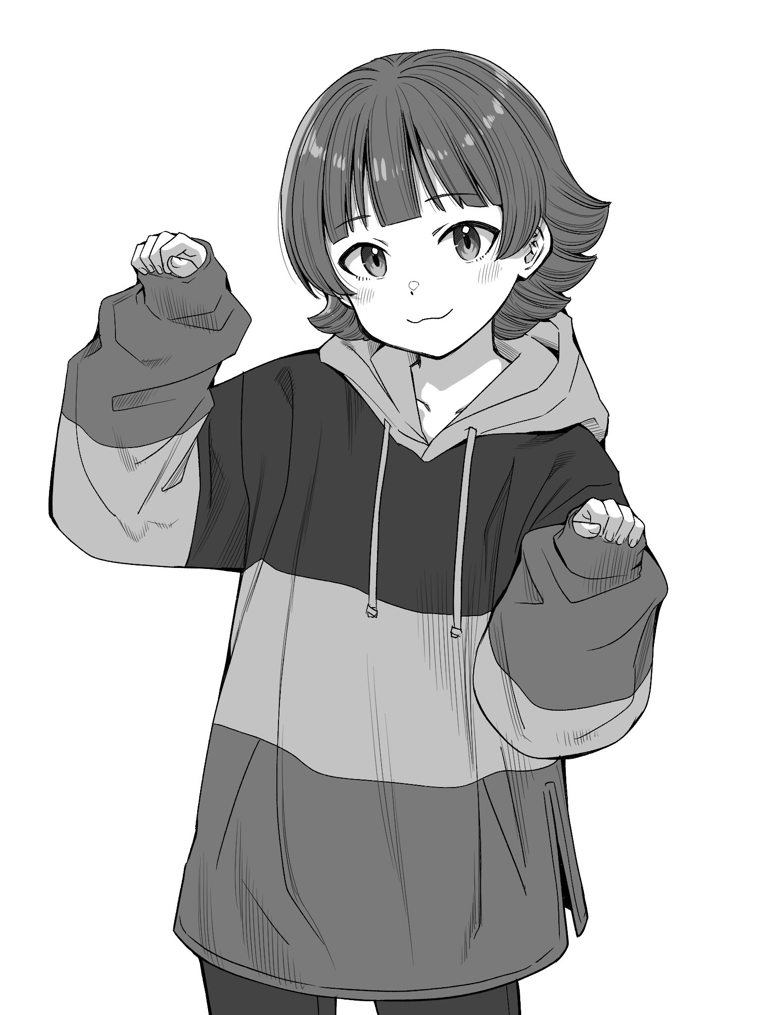 1girl :3 blush borrowed_clothes commentary_request cowboy_shot flipped_hair greyscale hands_up highres hood hoodie idolmaster idolmaster_million_live! light_smile long_sleeves looking_at_viewer matcha_kingyo monochrome multicolored_hoodie nonohara_akane short_hair simple_background solo white_background