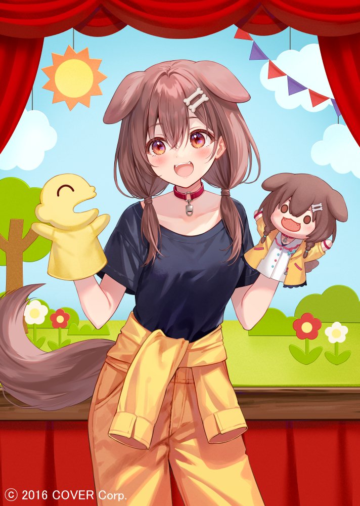 1girl 2016 :d animal_ears black_shirt blush bone_hair_ornament brown_hair clothes_around_waist cloud collar collarbone commentary_request copyright_notice cowboy_shot dog_ears dog_girl dog_tail flower fukahire_(ruinon) hair_between_eyes hair_ornament hand_puppet hands_up hololive inugami_korone long_hair looking_at_viewer official_art open_mouth pants puppet red_collar red_eyes shirt short_sleeves smile solo sun tail teeth tree upper_teeth_only virtual_youtuber yellow_pants