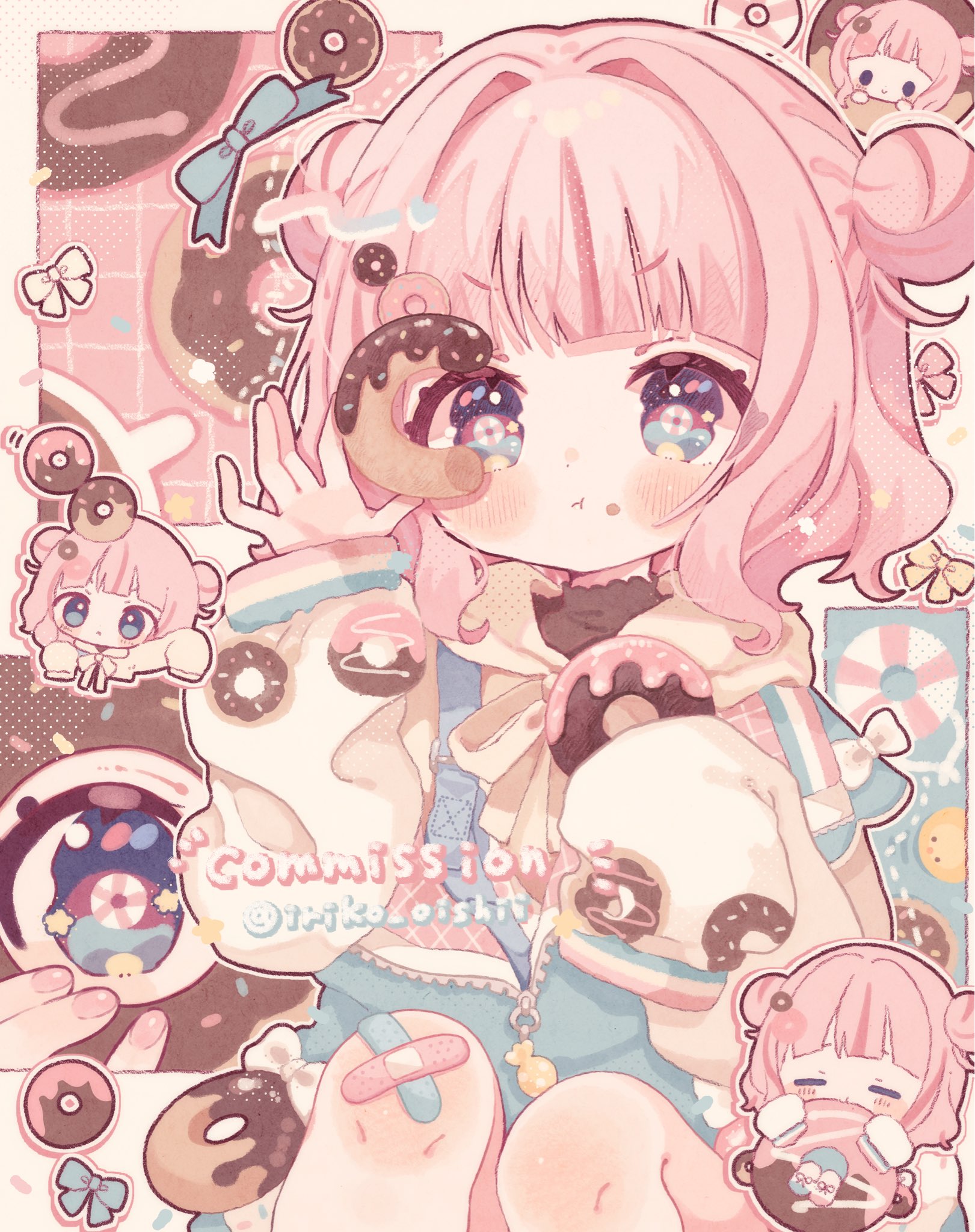 1girl :t bandaid bandaid_on_knee bandaid_on_leg blue_eyes blue_jacket blue_ribbon blunt_bangs blush chibi closed_mouth commentary_request commission crumbs donut double_bun eating feet_out_of_frame food hair_bun highres holding holding_donut holding_food hood hood_down hoodie indie_virtual_youtuber jacket kamizakana_iriko looking_at_viewer multiple_views neck_ribbon pink_hair ribbon short_hair skeb_commission sleeves_past_fingers sleeves_past_wrists twitter_username ukiwa_nagisa v-shaped_eyebrows virtual_youtuber yellow_hoodie yellow_ribbon