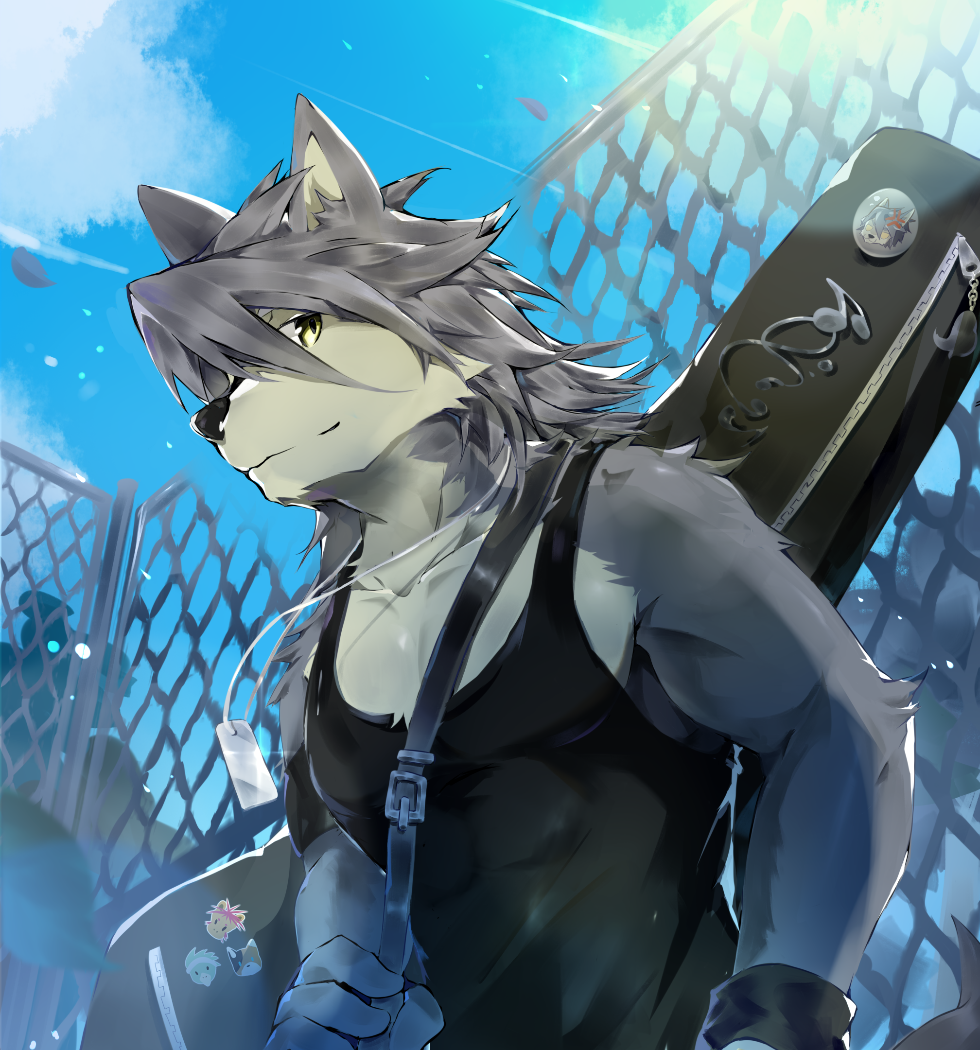 1boy animal_ears black_tank_top blue_sky chain-link_fence cloud cloudy_sky collarbone commentary_request dog_boy dog_ears animal_nose dog_tags dog_tail fence furry furry_male grey_fur grey_hair guitar_case highres instrument_case instrument_case_on_back jewelry jun_nekonishi keisuke_hirama kouya_aotsuki looking_at_viewer male_focus meooem morenatsu muscular muscular_male necklace sky smile tail tank_top yellow_eyes yuuki_torii