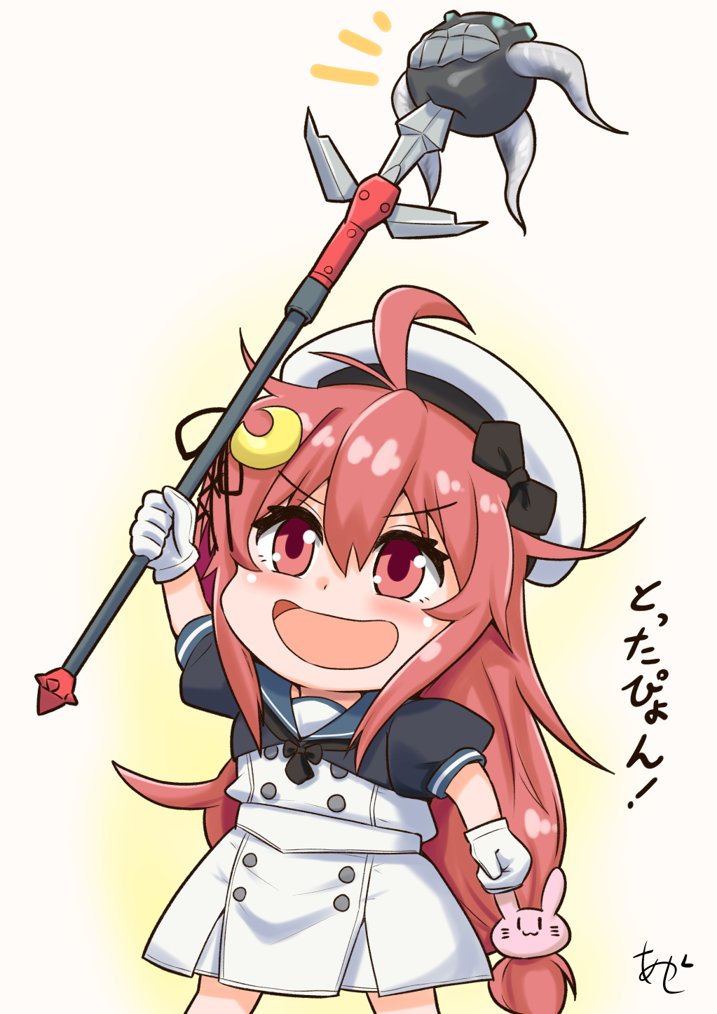 1girl abyssal_ship akashieru black_jacket black_neckerchief blue_sailor_collar cosplay crescent crescent_hair_ornament dress enemy_naval_mine_(kancolle) gloves hair_ornament hat highres jacket javelin_(kancolle) javelin_(kancolle)_(cosplay) kantai_collection long_hair low-tied_long_hair name_connection neckerchief object_namesake one-hour_drawing_challenge polearm rabbit_hair_ornament red_eyes red_hair sailor_collar sailor_dress sailor_hat short_sleeves smile solo spear teeth tentacles uzuki_(kancolle) very_long_hair weapon white_dress white_gloves white_hat