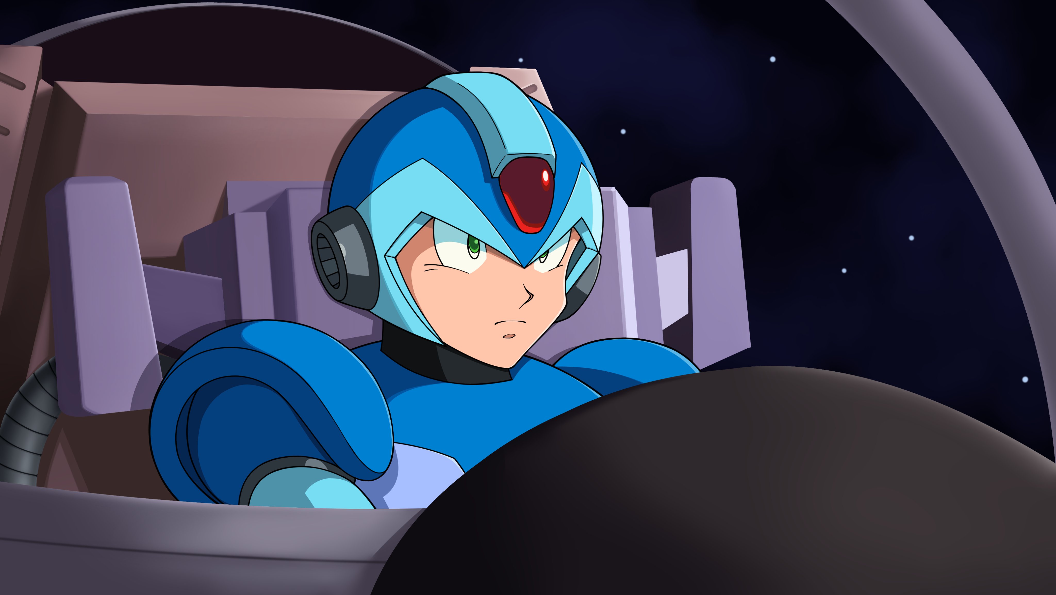 1boy absurdres android armor blue_armor blue_helmet closed_mouth diegodoodles forehead_jewel green_eyes helmet highres jewelry male_focus mega_man_(series) mega_man_x4 mega_man_x_(series) official_style robot robot_ears sensei_haruki_suetsugu_(style) sitting solo space spacecraft x_(mega_man)