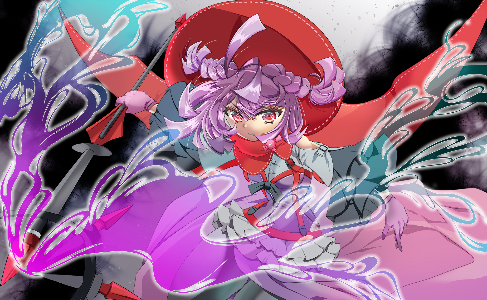 1girl ahoge angry artist_request bare_shoulders black_background black_bow black_bowtie black_pantyhose blunt_bangs blunt_ends bow bowtie braid buttons cape clenched_teeth clothing_cutout cowboy_shot eyelashes floating_clothes floating_hair frilled_skirt frilled_sleeves frills game_cg gloves grey_shirt grey_skirt hair_between_eyes hat highres holding holding_staff long_hair long_sleeves magia_record:_mahou_shoujo_madoka_magica_gaiden magical_girl mahou_shoujo_madoka_magica mahou_shoujo_madoka_magica_magia_exedra messy_hair miniskirt official_art outline pantyhose purple_gloves purple_hair purple_vest red_cape red_eyes red_hat ribbon-trimmed_cape ribbon-trimmed_headwear ribbon-trimmed_vest ribbon_trim sarasa_hanna shirt shoulder_cutout side_braids skirt solo staff suspender_skirt suspenders teeth train_(clothing) tsurime twin_braids two-tone_background umbrakinesis vest white_background white_outline