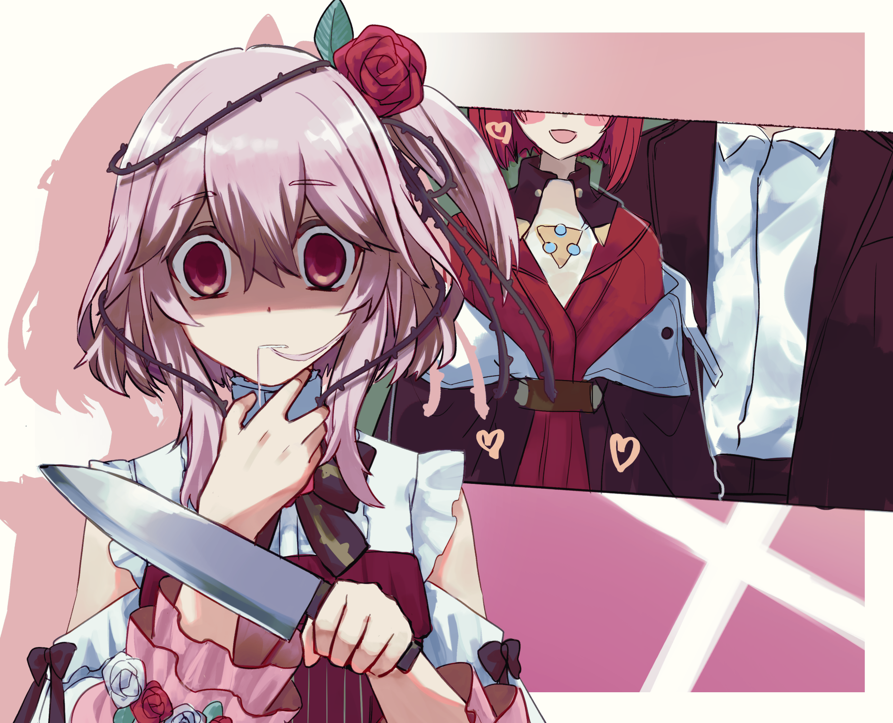 1boy 2girls ange_katrina ange_katrina_(1st_costume) clothing_cutout derivative_work empty_eyes eyes_out_of_frame faceless faceless_male flower hair_between_eyes hair_flower hair_in_own_mouth hair_ornament hair_vines hand_on_own_neck head_out_of_frame highres holding holding_knife kitchen_knife knife loving_aura medium_hair multiple_girls nijisanji nijisanji_en oji_(nyantyu081) partially_shaded_face pink_hair red_eyes red_flower red_rose rose rosemi_lovelock rosemi_lovelock_(1st_costume) shoulder_cutout side_ponytail thorns virtual_youtuber yandere yandere_no_onna_no_ko_ni_shinu_hodo_aisarete_nemurenai_cd