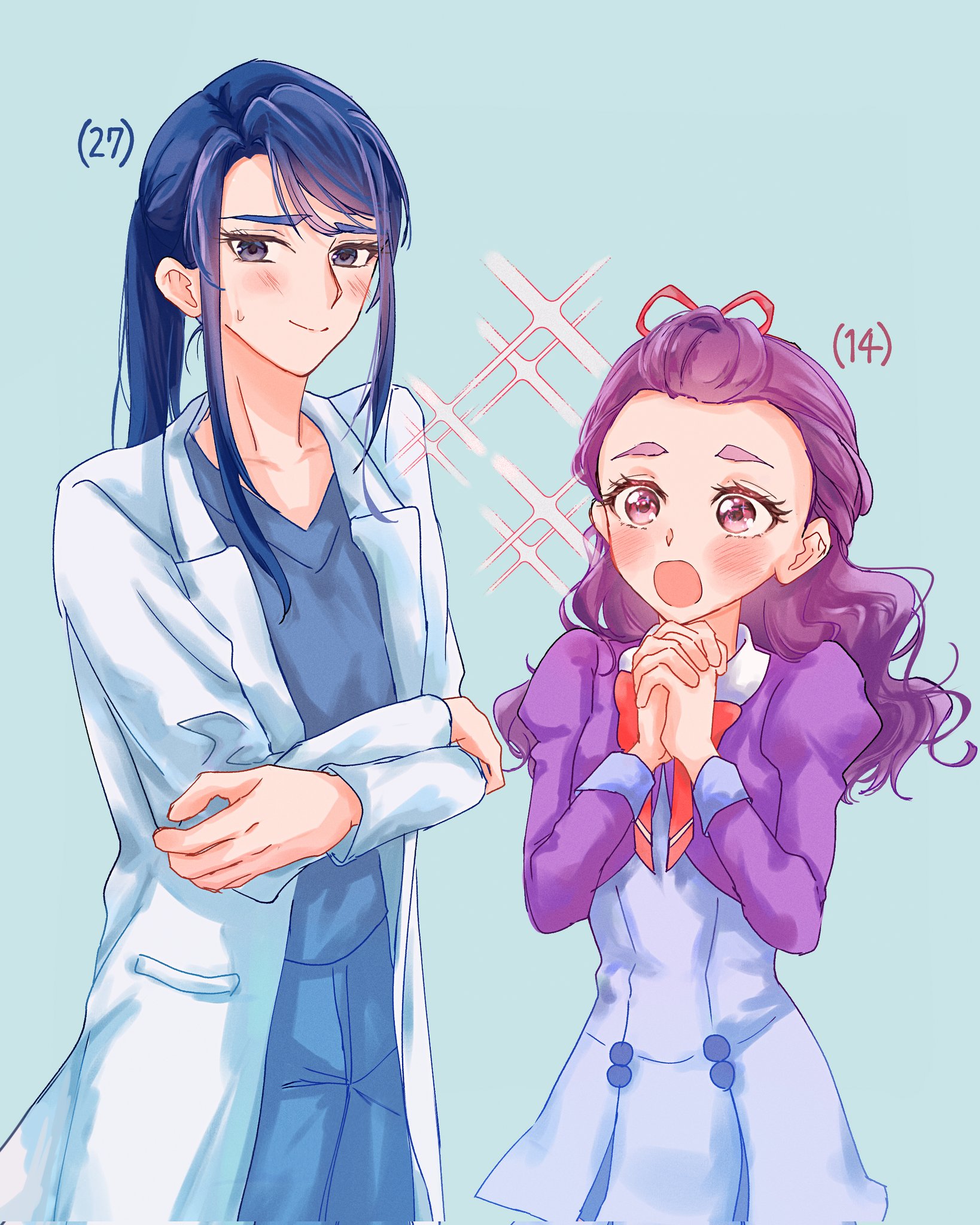 2girls :o blue_eyes blue_hair blue_shirt character_age collarbone cowboy_shot cure343_55 highres jacket kibou_no_chikara_otona_precure_'23 l'ecole_des_cinq_lumieres_school_uniform long_hair long_sleeves mimino_kurumi minazuki_karen multiple_girls open_mouth own_hands_together precure purple_eyes purple_hair purple_skirt school_uniform shirt skirt sweatdrop white_jacket yes!_precure_5 yes!_precure_5_gogo! yuri