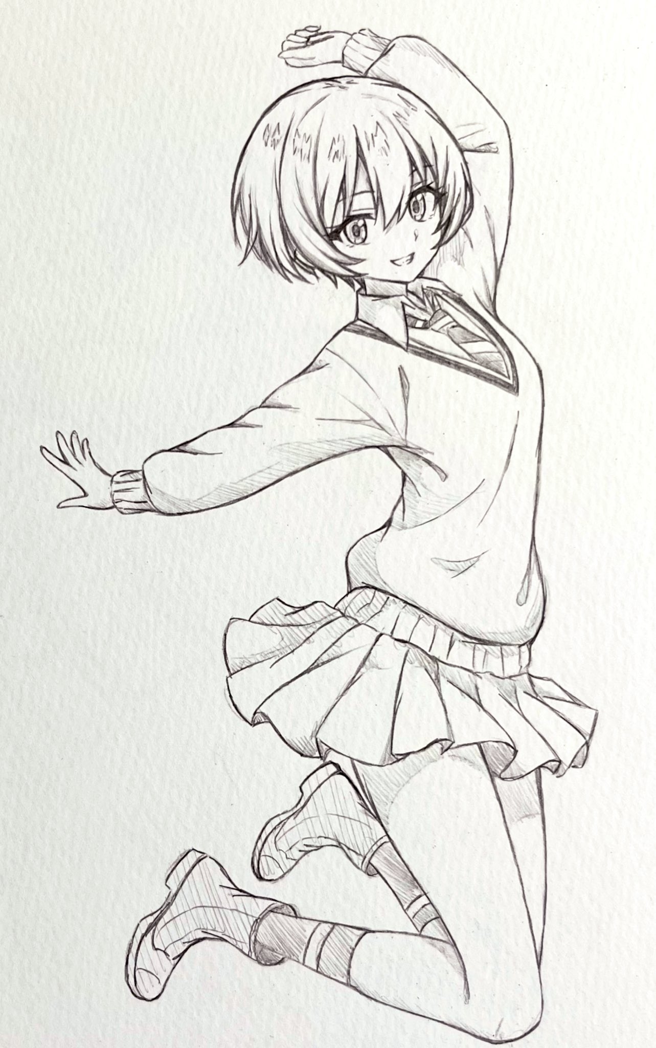 1girl amate_yuzuriha arms_up boots collared_shirt commentary_request full_body graphite_(medium) greyscale gundam gundam_gquuuuuux hair_between_eyes happy highres jumping looking_at_viewer monochrome necktie pleated_skirt seishun_dendeke shirt short_hair skirt smile socks solo sweater traditional_media