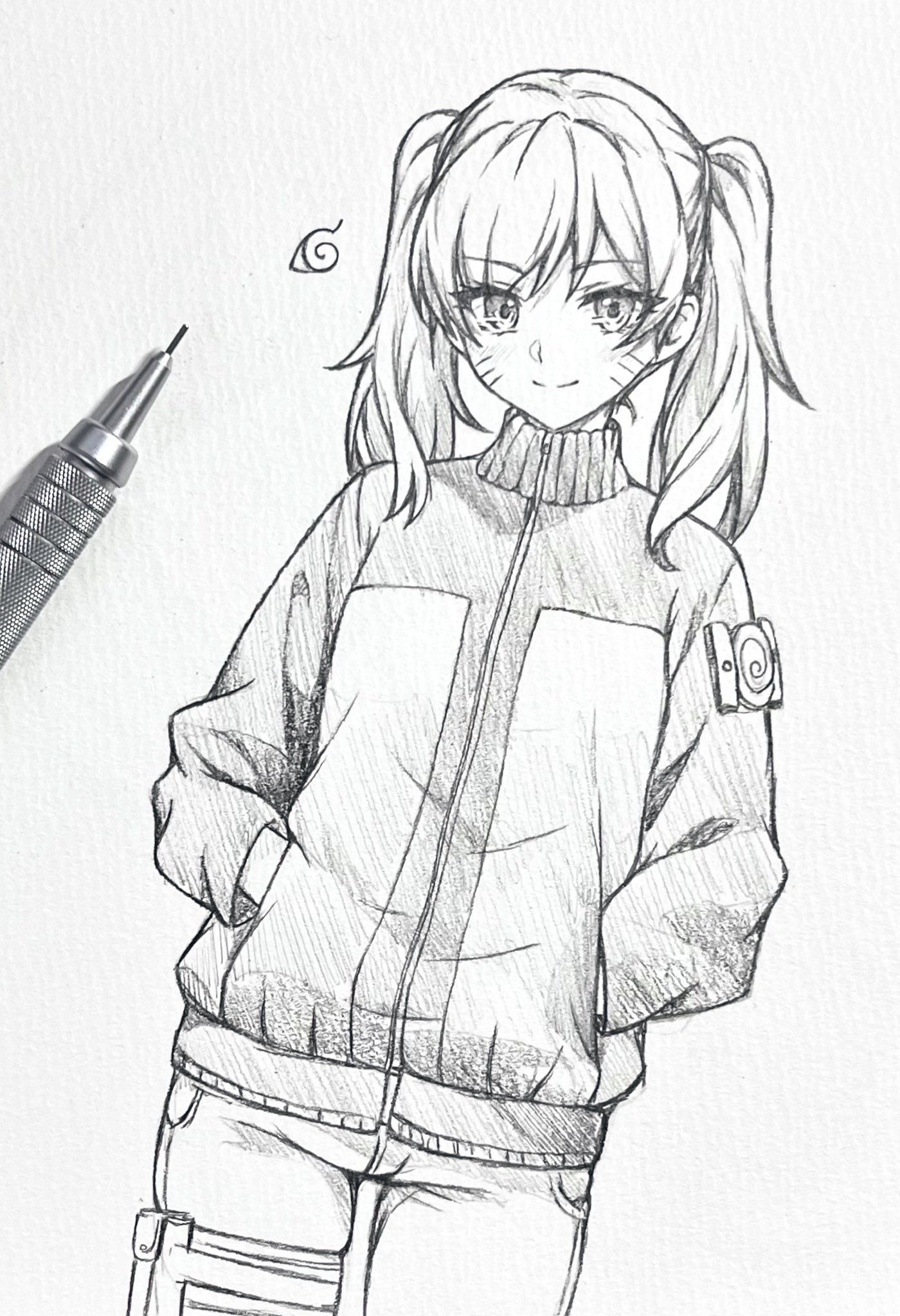 1girl art_tools_in_frame commentary_request cowboy_shot facial_mark graphite_(medium) greyscale hands_in_pockets highres jacket konohagakure_symbol monochrome naruko_(naruto) naruto_(series) naruto_shippuuden photo_(medium) seishun_dendeke smile solo traditional_media turtleneck turtleneck_jacket twintails whisker_markings