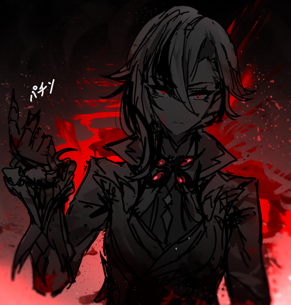 1girl angry arlecchino_(genshin_impact) closed_mouth cuffs explosion fingernails genshin_impact hair_between_eyes jacket korusakku long_fingernails looking_at_viewer peruere_(genshin_impact) red_eyes simple_background sketch smoke solo sparks standing upper_body