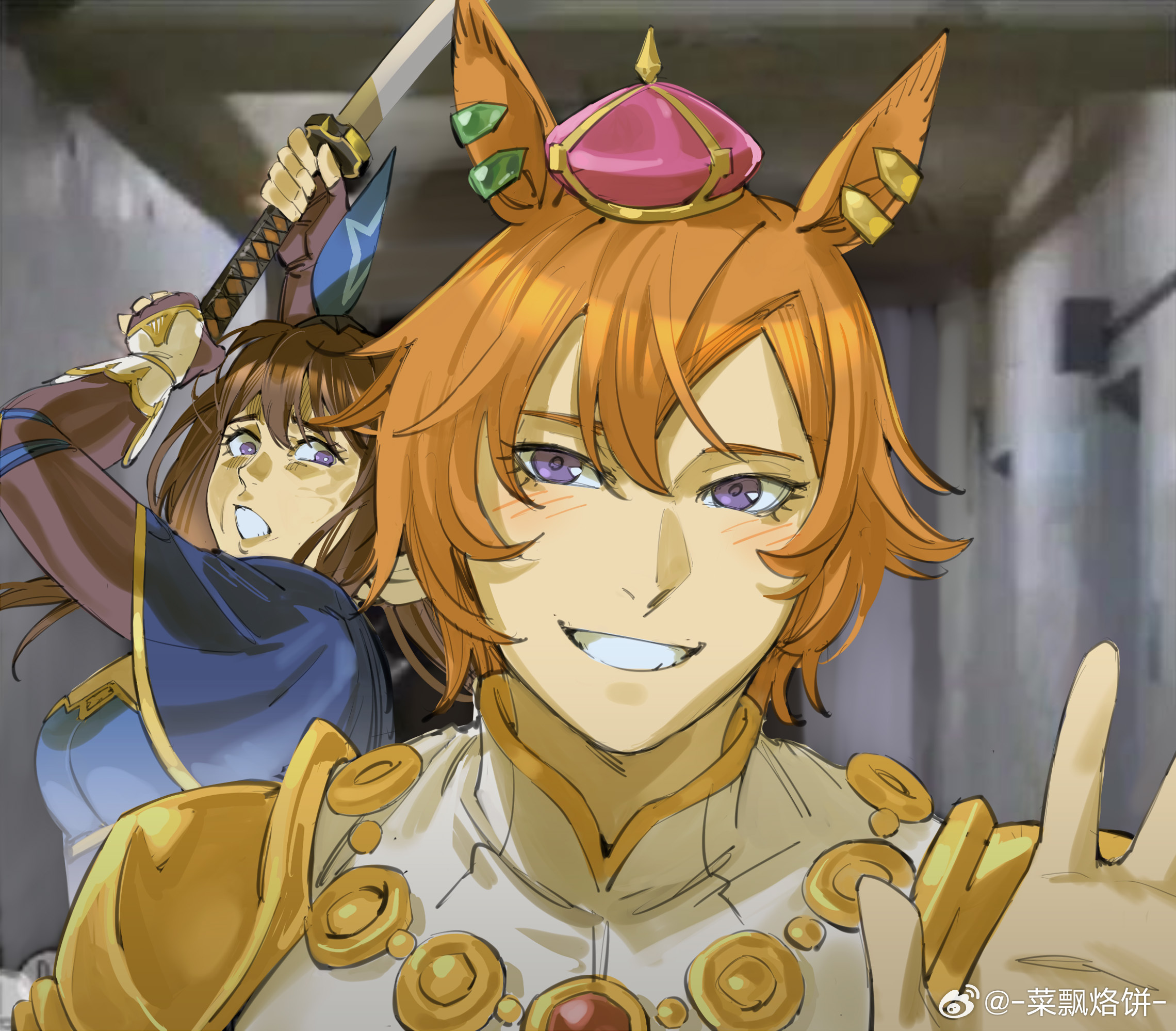 2girls admire_vega_(umamusume) animal_ears armor black_gloves blue_cape blue_dress breasts cape commentary crown dress ear_covers fingerless_gloves gloves grin hair_between_eyes highres holding holding_sword holding_weapon horse_ears horse_girl impending_doom long_hair medium_breasts mini_crown multiple_girls open_mouth orange_hair ponytail purple_eyes ruukii_drift short_hair shoulder_armor single_ear_cover smile sword t.m._opera_o_(umamusume) umamusume upper_body watermark waving weapon weibo_watermark