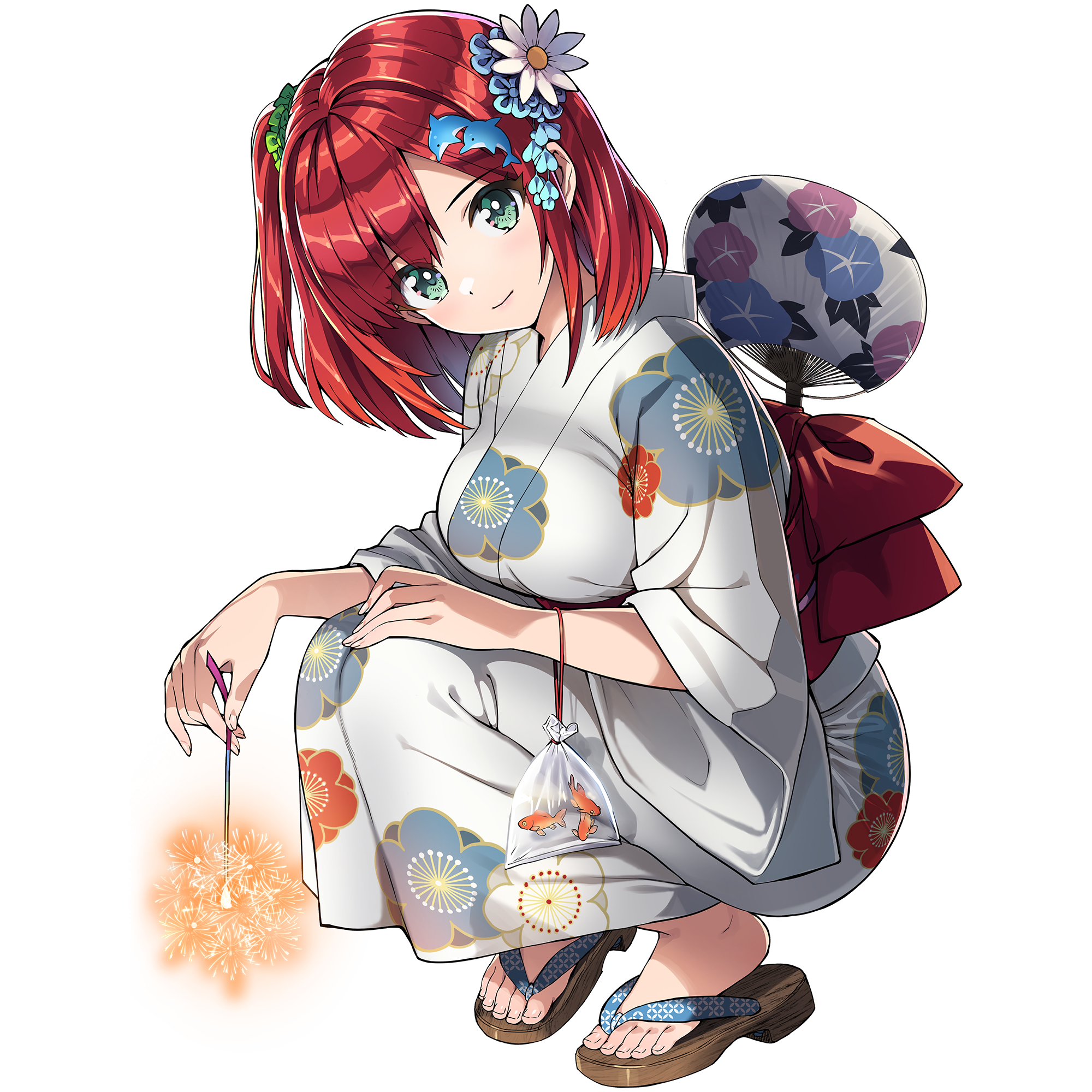 1girl back_bow bag bagged_fish bow breasts closed_mouth dolphin_wave fireworks fish floral_print floral_print_kimono flower game_cg green_eyes green_scrunchie hair_flower hair_ornament hair_scrunchie hand_fan head_tilt highres holding holding_fireworks japanese_clothes kimono large_breasts medium_hair non-web_source official_art one_side_up ootomo_takuji print_kimono red_bow red_hair sakimiya_iruka sandals scrunchie self-datamine smile solo sparkler squatting transparent_background white_kimono