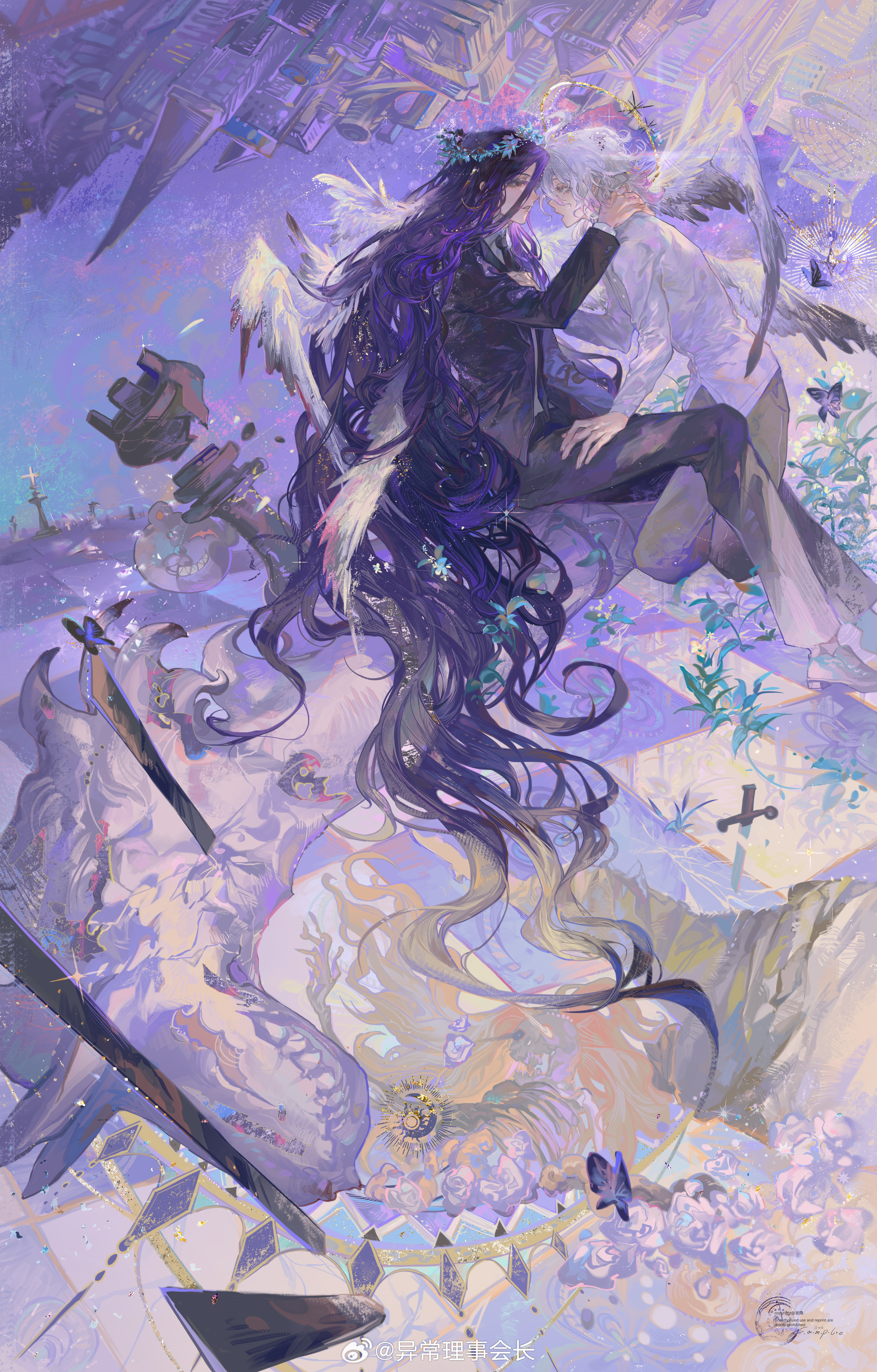 2boys absurdly_long_hair absurdres angel_wings black_hair black_jacket black_necktie black_pants black_shoes black_suit black_wings blazer buttons castle chess_piece chessboard collared_shirt danganronpa_(series) danganronpa_3_(anime) suit_pants dress_shirt dress_shoes eye_contact eyelashes feathered_wings flower formal_clothes full_body gradient_wings green_eyes grey_pants hair_between_eyes halo halo_behind_head hand_on_another's_shoulder hand_on_another's_thigh heads_together highres hope's_peak_academy_school_uniform imminent_kiss jacket kamukura_izuru komaeda_nagito light_particles long_hair long_hair_between_eyes looking_at_another male_focus messy_hair monokuma multicolored_wings multiple_boys multiple_wings necktie open_clothes open_jacket pants parted_lips pocket purple_sky red_eyes school_uniform seraph shirt shoes short_hair sitting sky sparkle suit teeth traditional_halo very_long_hair wavy_hair white_flower white_hair white_shirt white_wings wings yaoi yellow_halo yichang_lishi_huizhang