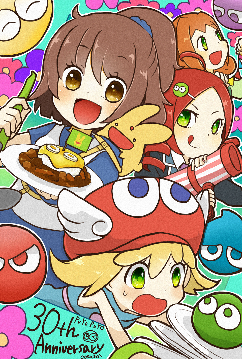 4girls ahoge ally_(puyopuyo) amitie_(puyopuyo) andou_ringo anniversary arle_nadja bambi-pix blonde_hair blue_shirt blush bracelet brown_hair carbuncle_(puyopuyo) copyright_name curry curry_rice food green_eyes hat highres holding holding_ladle jewelry ladle licking_lips multiple_girls open_mouth ponytail puyo_(puyopuyo) puyopuyo red_hair red_hat rice shirt string_of_flags tongue tongue_out vest white_vest winged_hat