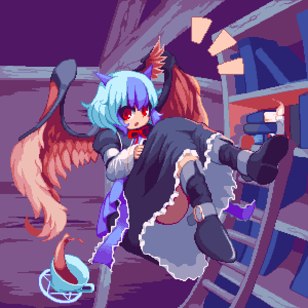 1girl bird_wings bookshelf boots cup curiosities_of_lotus_asia horns multicolored_hair pixel_art red_eyes teacup tokiko_(touhou) touhou wings yado_taityou