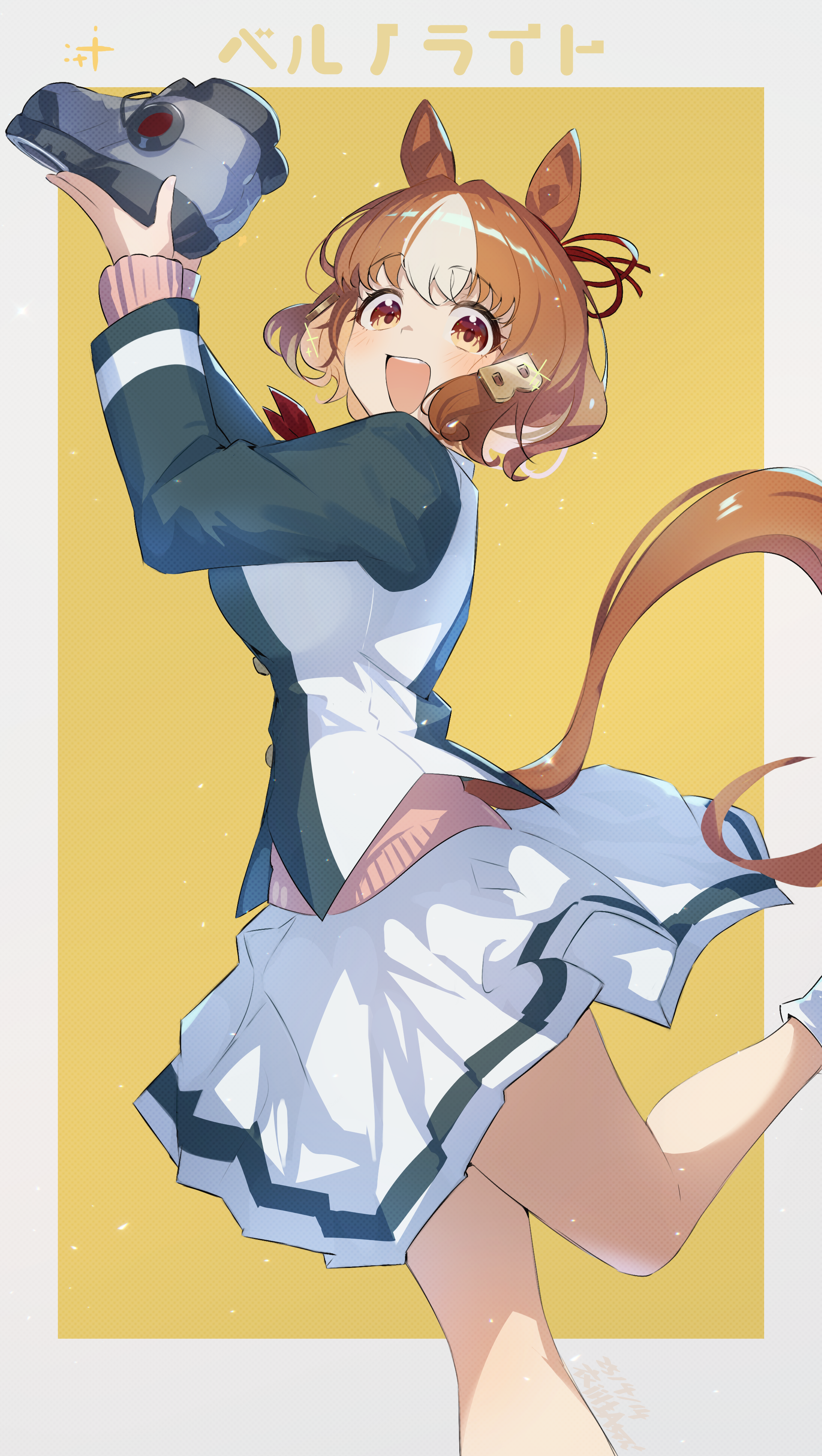 1girl absurdres animal_ears belno_light_(umamusume) black_jacket blazer bow brown_hair character_name commentary ear_ribbon from_side hair_ornament highres holding holding_shoes holding_unworn_clothes horse_ears horse_girl horse_tail jacket leg_up long_sleeves looking_at_viewer miniskirt multicolored_hair neck_ribbon open_mouth pink_sweater pleated_skirt red_ribbon ribbon school_uniform shoes short_hair skirt smile socks solo sparkle standing standing_on_one_leg sweater tail translated two-tone_hair umamusume umamusume:_cinderella_gray unworn_shoes white_hair white_jacket white_skirt white_socks yakousei_a yellow_background