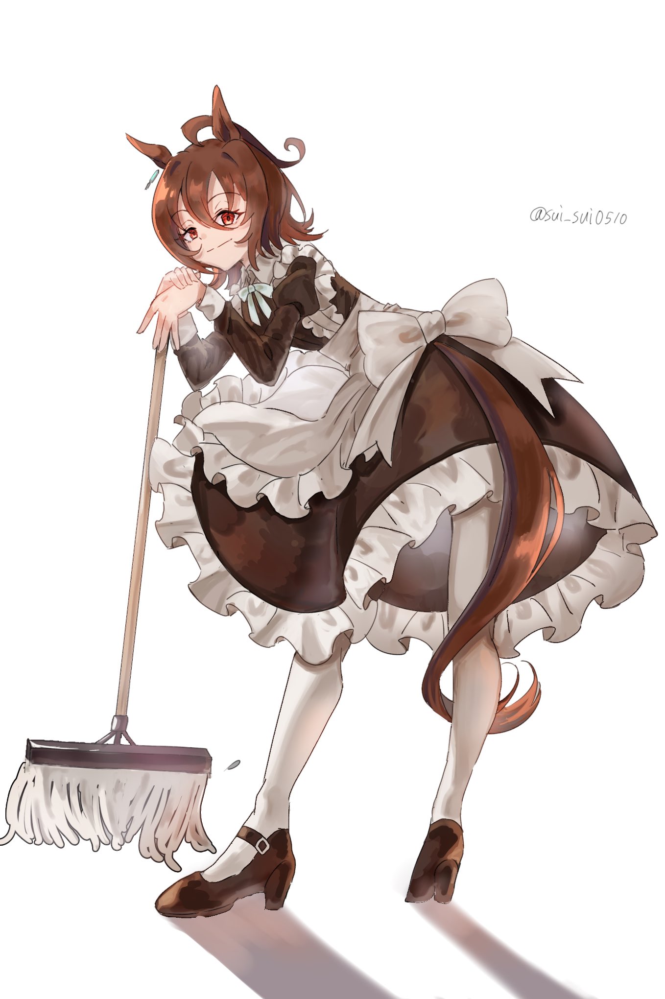 1girl agnes_tachyon_(umamusume) ahoge animal_ears apron black_dress black_shoes bow brown_hair chemical_structure closed_mouth dress earrings frilled_apron frilled_dress frills hair_between_eyes high_heels highres holding holding_mop horse_ears horse_girl horse_tail huge_ahoge jewelry long_sleeves medium_hair mop pantyhose puffy_sleeves red_eyes shoes simple_background single_earring smile solo standing sui_sui0510 tail twitter_username umamusume waist_bow white_apron white_background white_bow white_pantyhose white_trim wolf_cut