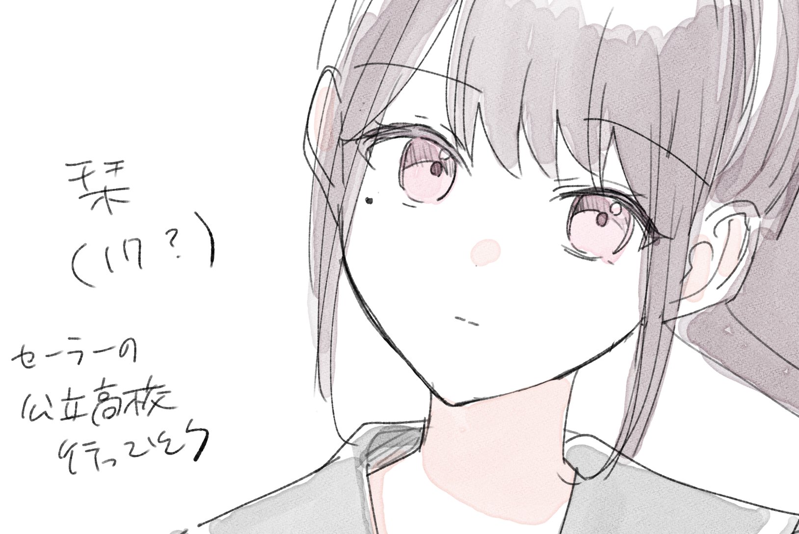 1girl aged_up asaka_kaori closed_mouth commentary_request highres kimi_to_tsuzuru_utakata mole mole_under_eye paid_reward_available ponytail red_eyes simple_background solo translation_request white_background yuama