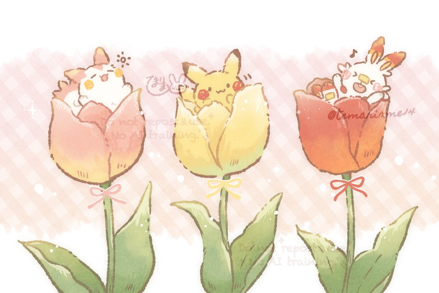 >_< :3 :d =_= blush_stickers closed_mouth commentary_request eighth_note flower furret gen_1_pokemon gen_2_pokemon gen_8_pokemon musical_note nintendo no_humans open_mouth pikachu pink_flower pink_ribbon pokemon pokemon_(creature) red_flower red_ribbon ribbon scorbunny smile squeans temariame14 tulip twitter_username watermark yellow_flower yellow_ribbon