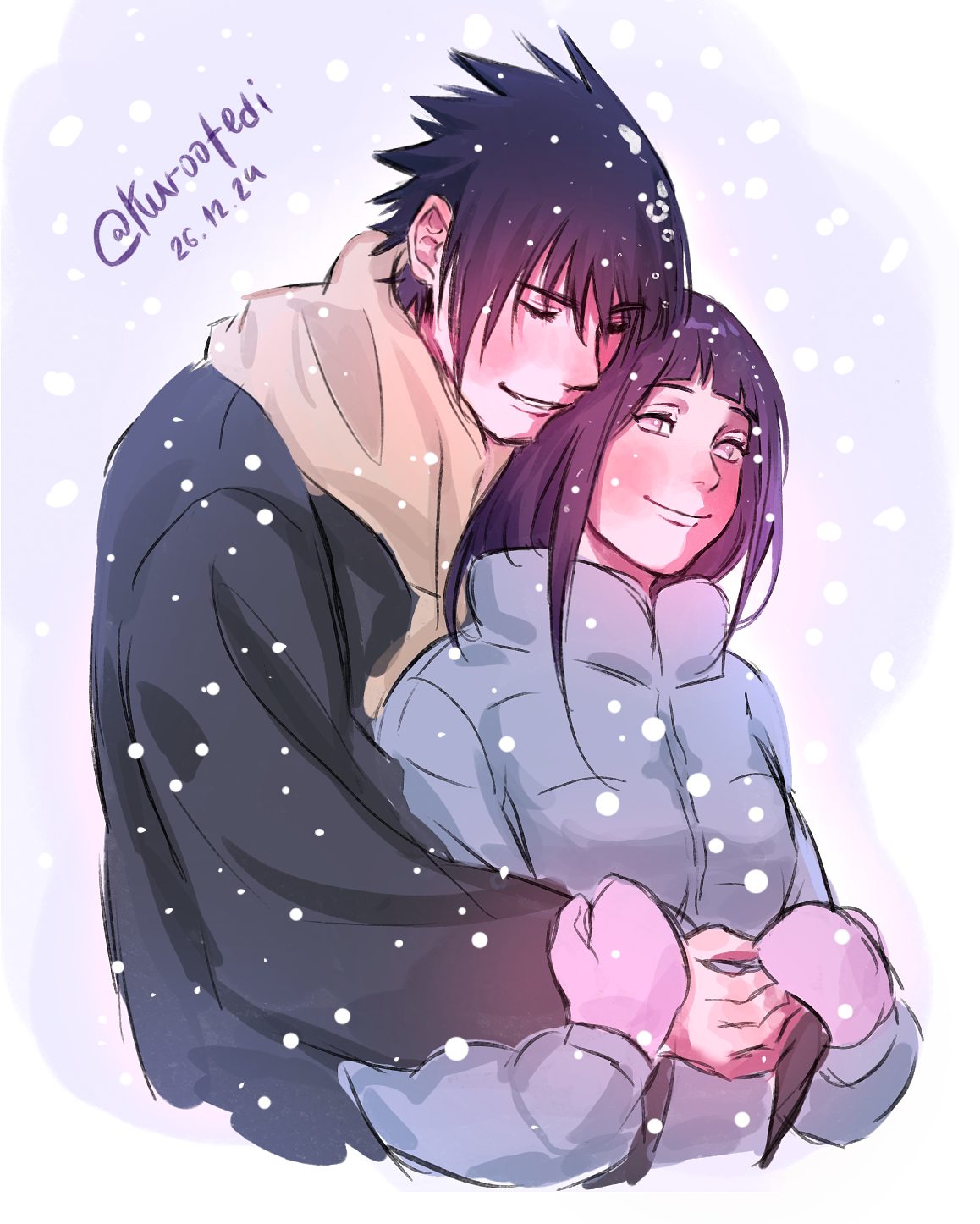 1boy 1girl 2024 black_coat black_hair closed_eyes coat commentary couple dated english_commentary gloves grey_coat hetero highres hug hug_from_behind hyuuga_hinata kurootedi long_hair naruto_(series) naruto_shippuuden pink_gloves scarf short_hair smile snowing twitter_username uchiha_sasuke