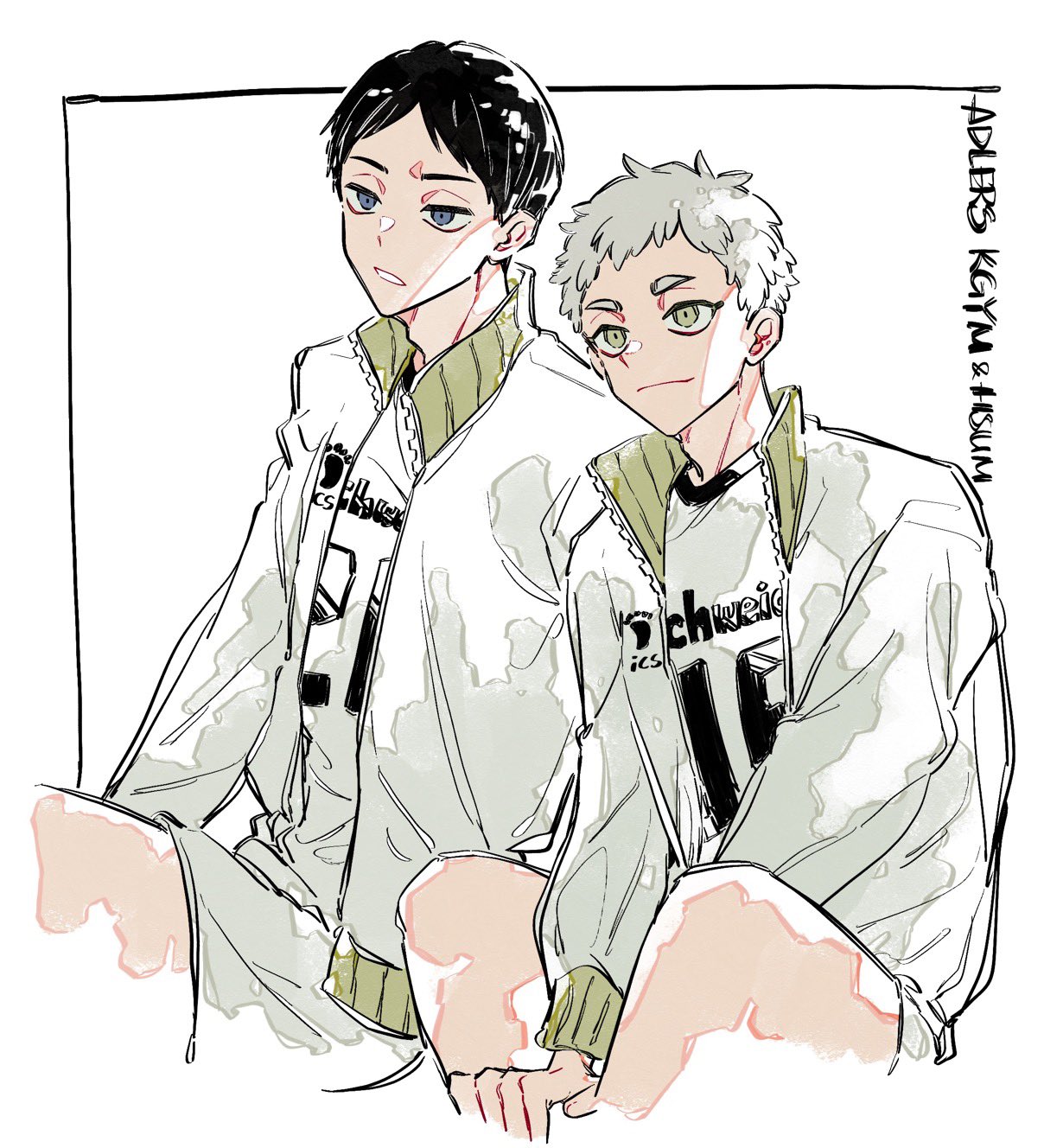 2boys adam's_apple black_hair blue_eyes closed_mouth coco_(238243) collared_jacket commentary crew_neck cropped_legs grey_eyes grey_hair haikyuu!! highres hoshiumi_kourai jacket kageyama_tobio long_sleeves looking_ahead male_focus multiple_boys open_clothes open_jacket parted_bangs parted_lips popped_collar shirt shorts sitting sportswear unzipped volleyball_uniform white_background white_shorts zipper