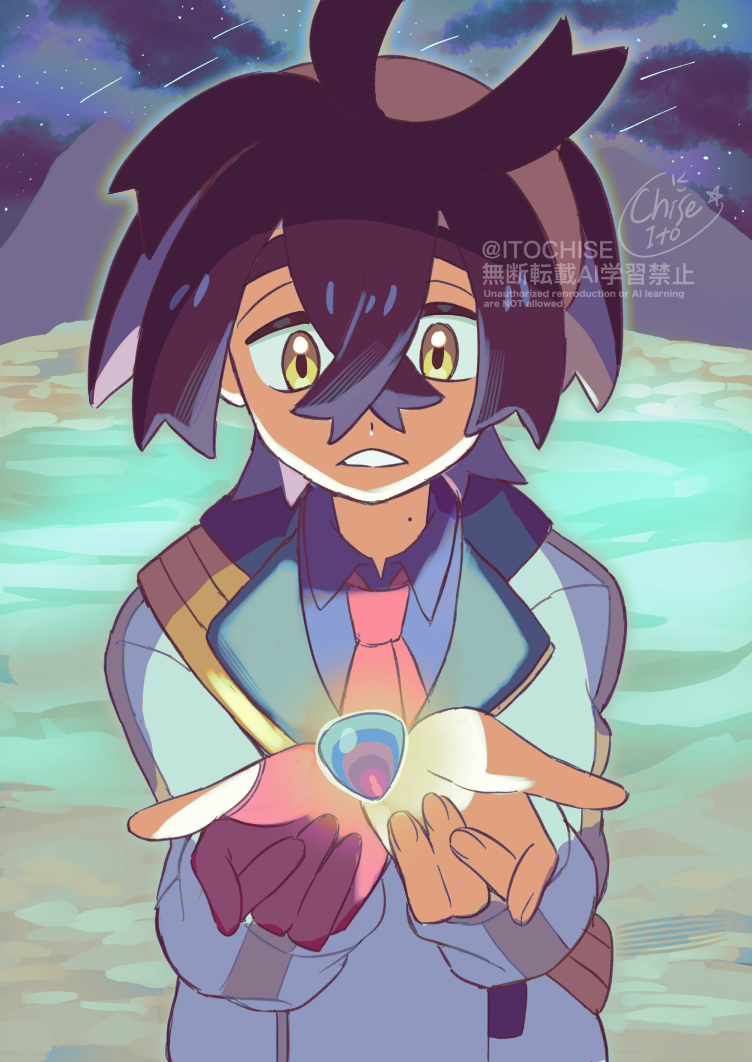 1boy black_hair blue_shirt collared_shirt commentary_request crossed_bangs gloves hair_between_eyes hairband hands_up jacket kieran_(pokemon) looking_down male_focus mole mole_on_neck necktie nintendo orange_(orangelv20) partially_fingerless_gloves pokemon pokemon_scarlet_and_violet red_gloves red_necktie shirt signature single_glove solo teeth upper_body watermark yellow_eyes