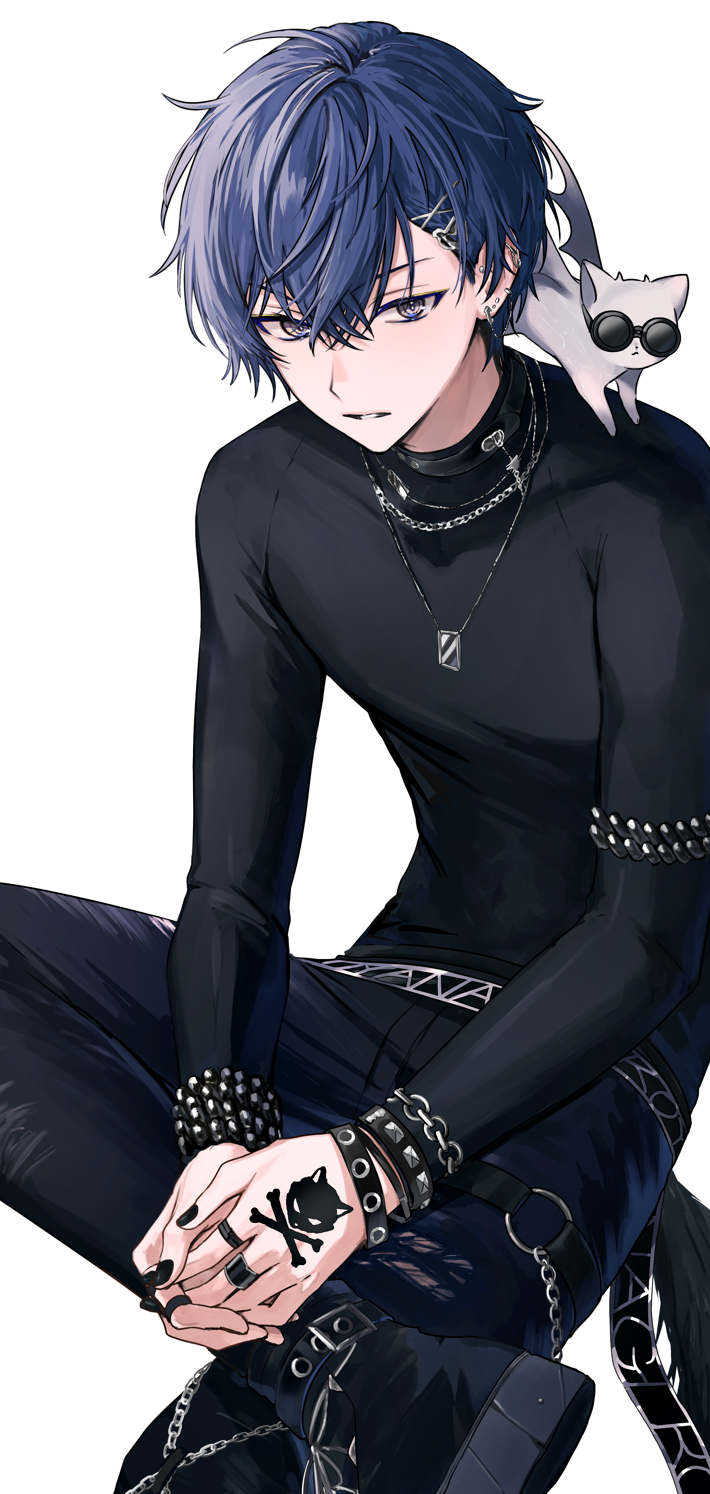 1boy :< absurdres animal animal_on_shoulder armband belt belt_collar black_belt black_boots black_collar black_nails black_pants black_shirt blue_hair boots bracelet cat cat_on_shoulder chain closed_mouth collar commentary_request crossed_bangs ear_chain ear_piercing earrings figure_four_sitting hair_between_eyes hair_ornament hairclip hand_tattoo highres jewelry koyanagi_rou koyanagi_rou_(2nd_costume) linked_piercing long_sleeves looking_to_the_side male_focus multicolored_eyes multiple_bracelets multiple_earrings nail_polish necklace nijisanji otomo_(koyanagi_rou) own_hands_clasped own_hands_together pants parted_bangs parted_lips piercing shirt short_hair simple_background sitting solo studded_bracelet sunglasses tattoo tone_haruma transparent_background virtual_youtuber white_cat