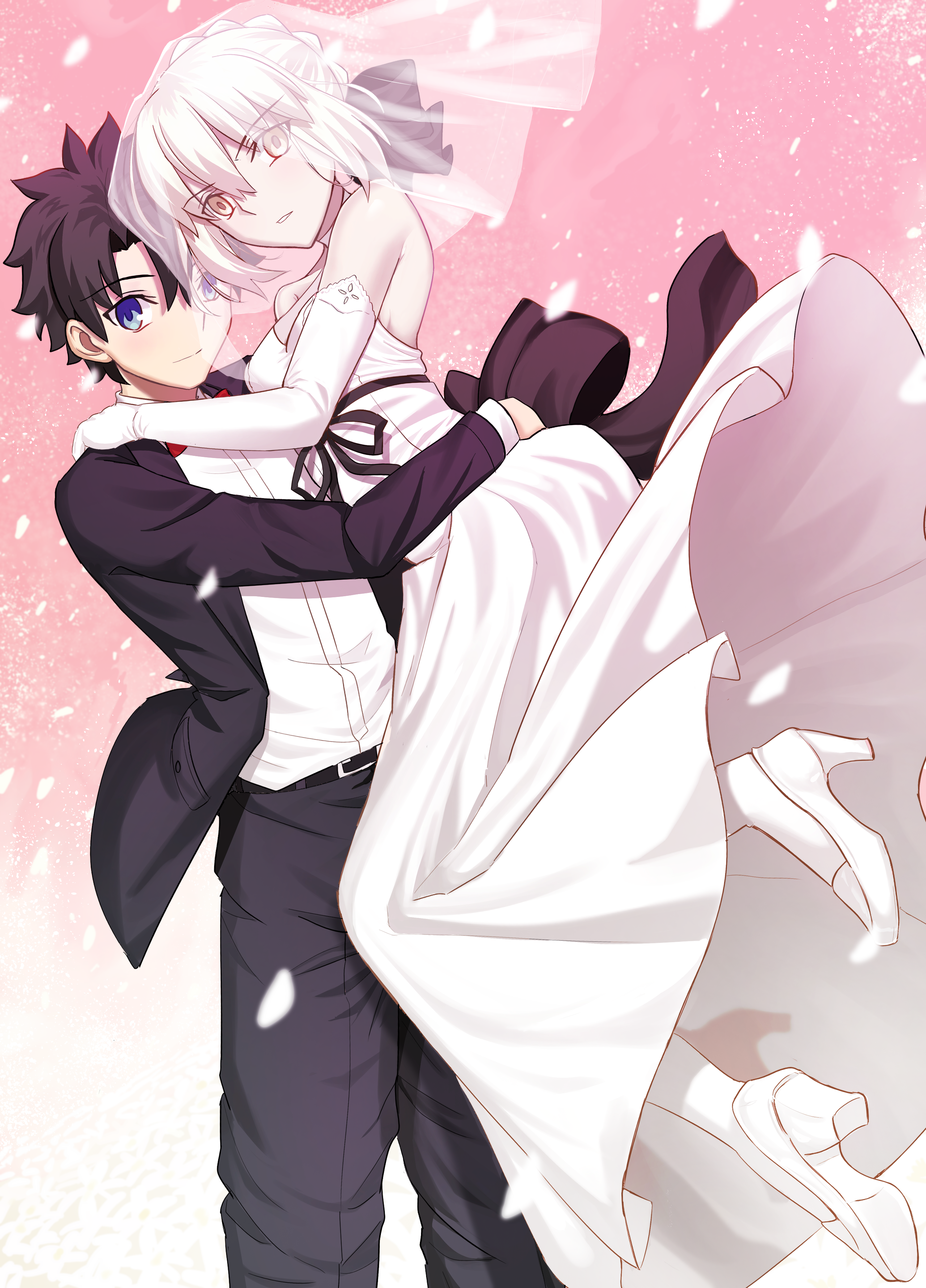 1boy 1girl absurdres angra_mainyu_(fate) artoria_pendragon_(fate) black_hair black_jacket black_pants black_ribbon blonde_hair blue_eyes bridal_veil corruption dark_persona dress elbow_gloves fate/grand_order fate_(series) fujimaru_ritsuka_(male) gloves hetero high_heels highres hug jacket longdq3008 looking_at_viewer pants possessed possession ribbon saber_alter shirt short_hair veil wedding_dress white_dress white_gloves white_shirt yellow_eyes