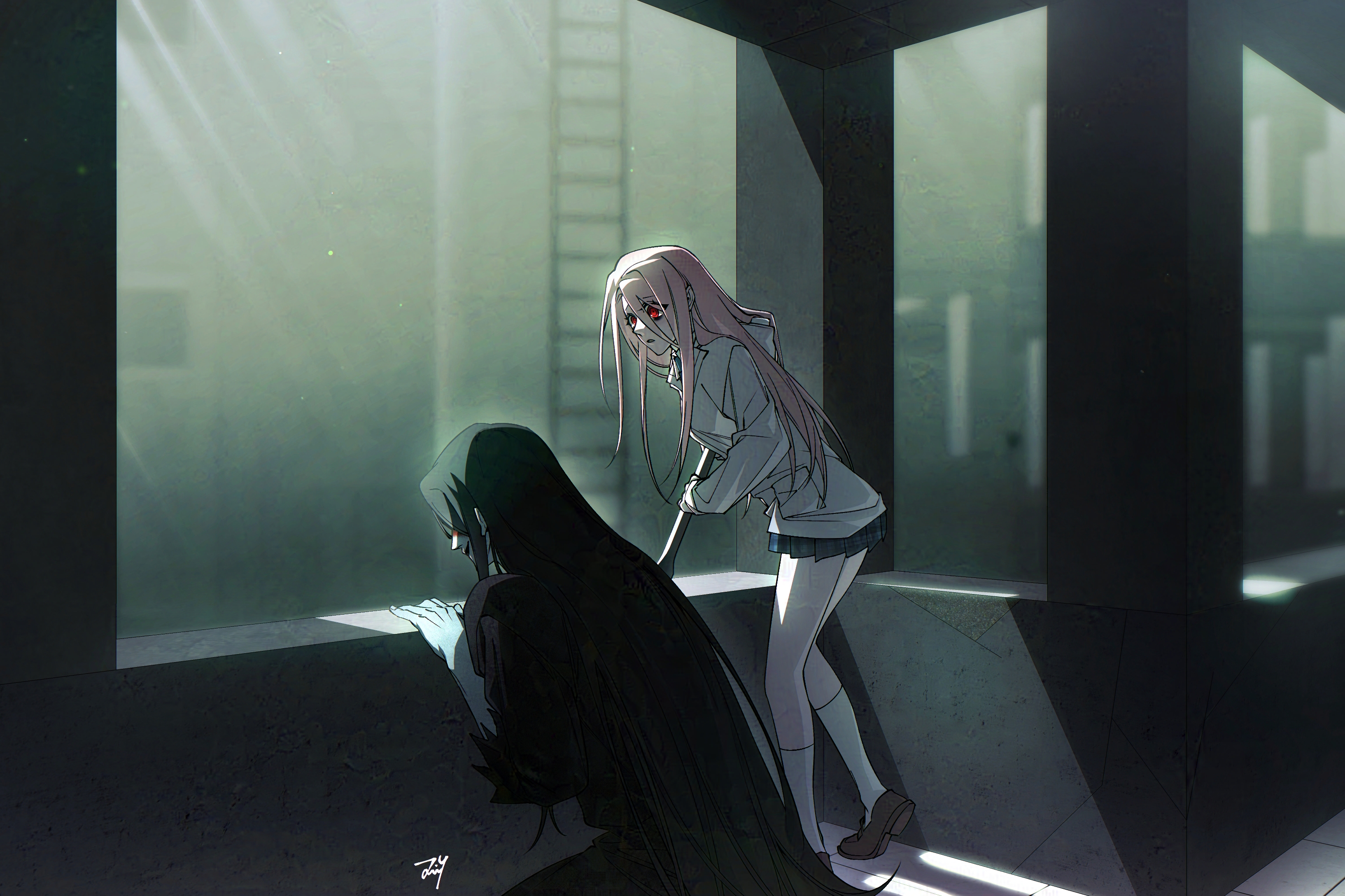 1boy 1girl bbabbamis2 black_hair black_kimono commentary_request crowbar adashino_adami highres holding holding_crowbar homicipher indoors japanese_clothes kimono korean_commentary long_hair looking_at_another mr._crawling pink_hair raincoat red_eyes skirt very_long_hair
