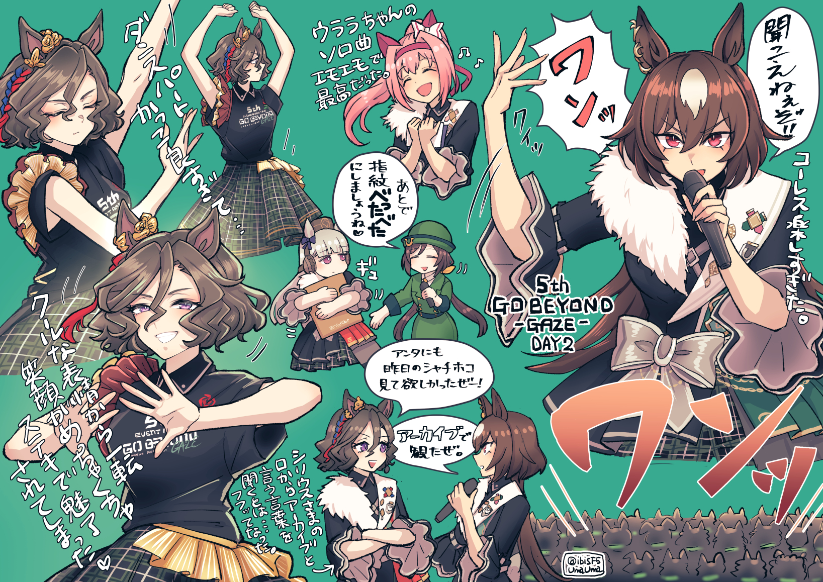 5girls animal_ears arms_up black_jacket black_shirt book bow brown_hair closed_eyes commentary_request crowd dress ear_covers ear_ornament fur-trimmed_jacket fur_trim gold_ship_(umamusume) green_background green_dress green_skirt grey_hair grin hair_between_eyes haru_urara_(umamusume) hayakawa_tazuna hi_(ibisf5umauma) highres holding holding_book holding_microphone horse_ears horse_girl horse_tail jacket long_hair looking_at_viewer microphone multicolored_hair multiple_girls official_alternate_costume open_mouth pillbox_hat pin pink_hair plaid_clothes plaid_skirt purple_bow purple_eyes red_eyes shirt short_hair short_sleeves simple_background sirius_symboli_(umamusume) skirt smile speech_bubble splendor_of_onyx_(umamusume) streaked_hair tail tap_dance_city_(umamusume) translation_request umamusume very_long_hair waving white_hair wide_sleeves