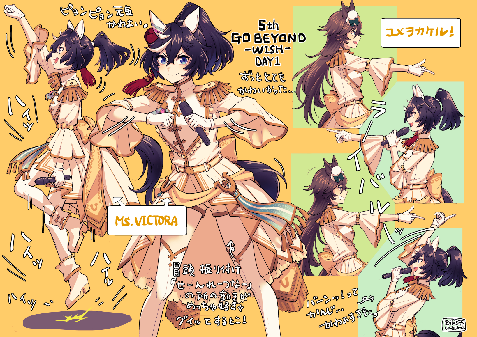 +++ 2girls ahoge animal_ears arm_up belt black_hair blue_eyes boots breasts brown_hair clenched_hands closed_mouth ear_covers english_text epaulettes finger_gun gloves grin half-skirt hat hi_(ibisf5umauma) high_collar high_heel_boots high_heels highres holding holding_microphone horse_ears horse_girl horse_tail jacket katsuragi_ace_(umamusume) long_hair long_sleeves looking_at_viewer microphone mini_hat mini_top_hat motion_lines mr._c.b._(umamusume) multiple_girls multiple_views open_mouth outstretched_arm pointing ponytail road_of_radiance_(umamusume) shoes short_hair shorts skirt small_breasts smile standing tail thighhighs top_hat translation_request twitter_username umamusume white_gloves white_jacket white_shoes white_shorts white_skirt white_thighhighs yellow_background