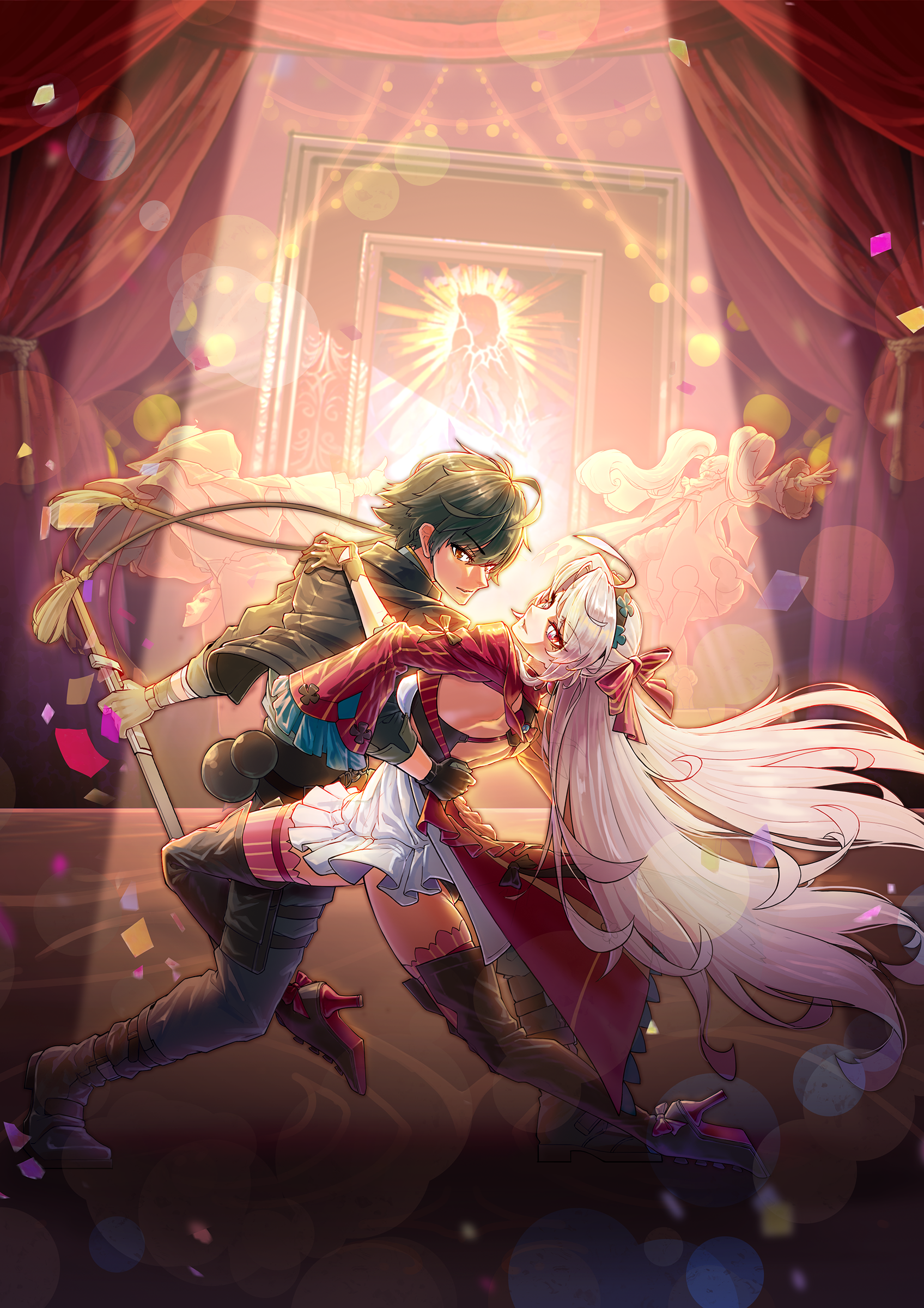 absurdres ahoge backless_dress backless_outfit bandaged_arm bandaged_hand bandages black_gloves black_hair black_jacket black_pants black_shoes bow bowtie brant_(wuthering_waves) carlotta_(wuthering_waves) d0h0nai dancer dancing dress flower gloves hair_flower hair_ornament hand_on_another's_back headband high_heels highres holding holding_sword holding_weapon jacket light_smile long_hair looking_at_viewer male_rover_(wuthering_waves) open_mouth pangu_terminal_(wuthering_waves) pants pink_bow pink_bowtie pink_eyes roccia_(wuthering_waves) rover_(wuthering_waves) shoes smile stage stage_lights sword weapon white_hair wuthering_waves yellow_eyes