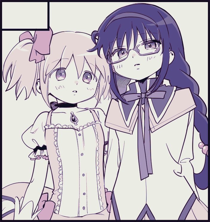 2girls akemi_homura akemi_homura_(magical_girl) black_border black_bow black_capelet black_choker black_gem border bow bow_choker bowtie braid bubble_skirt buttons capelet center_frills chest_jewel choker circle_cut collared_capelet commentary_request cowboy_shot dot_nose dress expressionless eyelashes frilled_dress frilled_sleeves frills gem glasses gloves grey_background grey_hairband hair_bobbles hair_bow hair_ornament hairband heads_together high_collar kaname_madoka kaname_madoka_(magical_girl) light_blush limited_palette long_hair long_sleeves low_twin_braids magical_girl mahou_shoujo_madoka_magica mahou_shoujo_madoka_magica_(anime) multiple_girls no+bi= parted_lips pink_bow pink_capelet pink_dress pink_eyes pink_hair pink_skirt pleated_skirt puffy_short_sleeves puffy_sleeves purple-framed_eyewear purple_bow purple_bowtie purple_eyes purple_hair short_dress short_hair short_sleeves short_twintails sidelocks simple_background skirt skirt_under_dress standing tareme twin_braids twintails two-tone_capelet very_long_hair waist_bow white_dress white_gloves white_skirt white_sleeves
