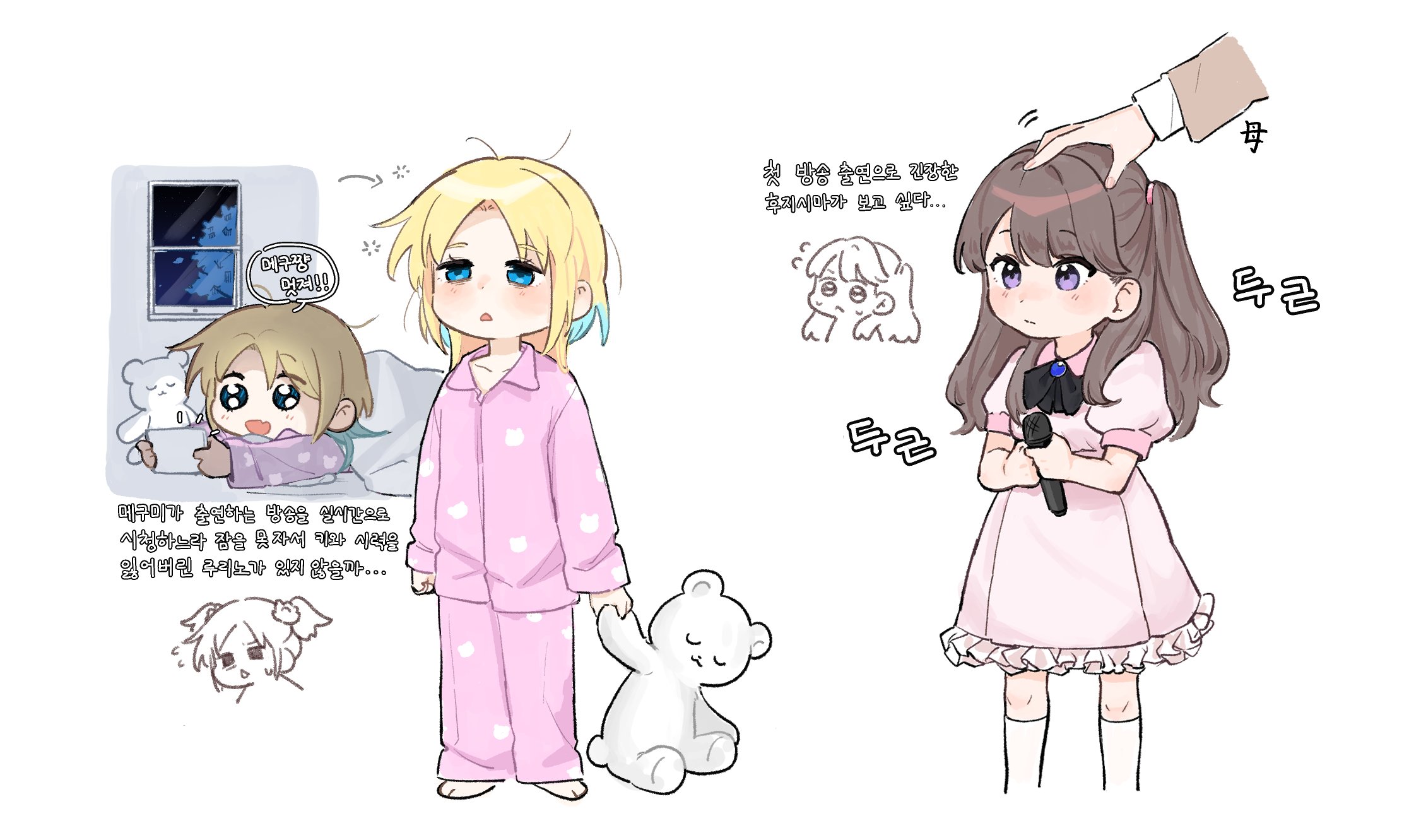 3girls :d basil_(wgh0anzdple3asf) blonde_hair blue_hair blush brown_hair closed_eyes closed_mouth commentary_request dress fang flying_sweatdrops frilled_dress frills fujishima_megumi fujishima_megumi's_mother fujishima_megumi_(young) hair_down headpat highres holding holding_microphone holding_phone kneehighs korean_commentary korean_text link!_like!_love_live! long_sleeves love_live! lying medium_dress microphone motion_lines multiple_girls multiple_views on_bed on_stomach open_mouth osawa_rurino osawa_rurino_(young) pajamas phone pink_dress pink_pajamas puffy_short_sleeves puffy_sleeves purple_eyes short_sleeves skin_fang smile socks squeans standing stuffed_animal stuffed_toy teddy_bear translation_request two_side_up u_u virtual_youtuber white_background white_socks