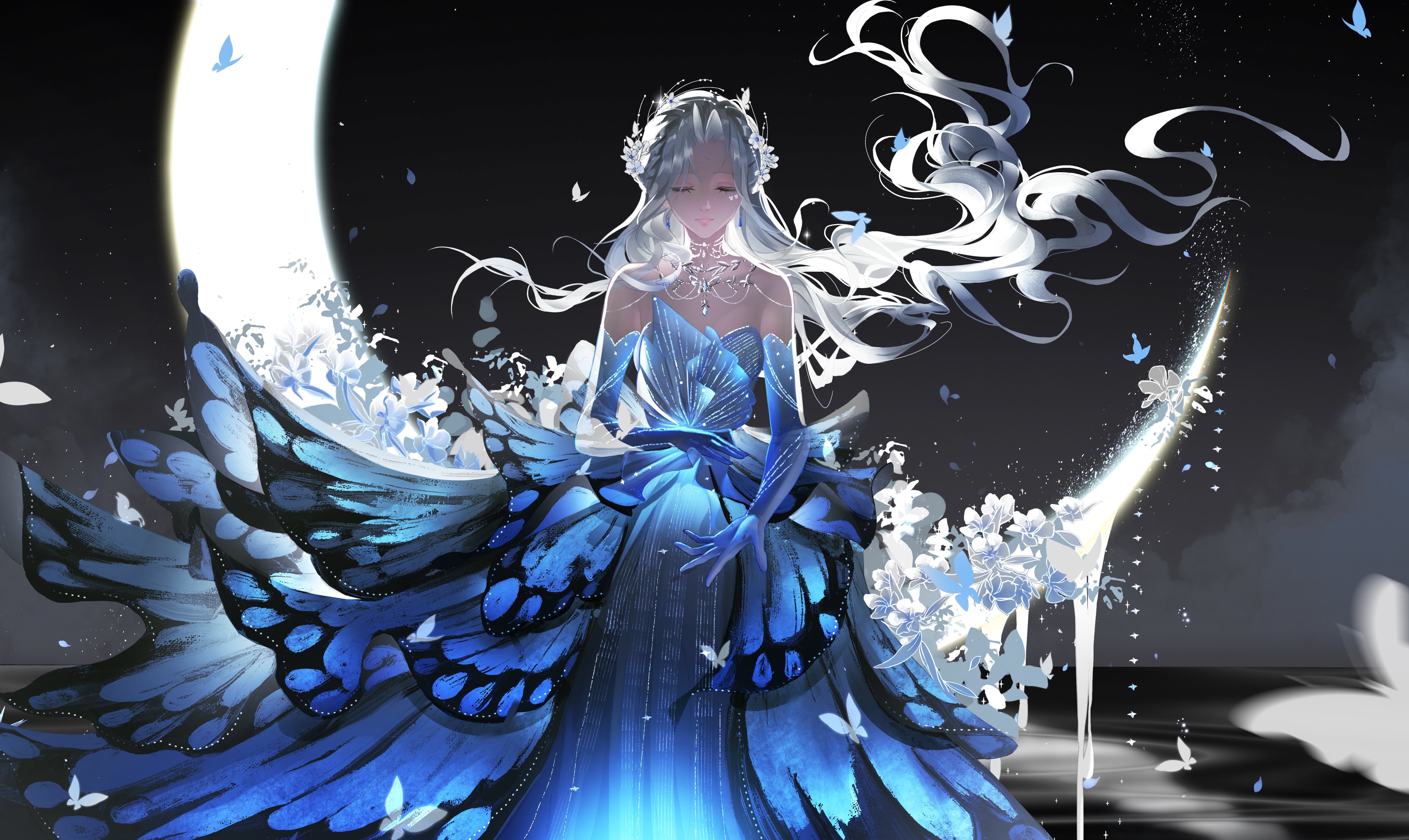 1girl absurdres bare_shoulders blue_butterfly blue_dress blue_gloves bug butterfly butterfly_dress closed_eyes closed_mouth crescent_moon dress dripping elbow_gloves expressionless eyelashes floating_hair flower flutter_storm_(infinity_nikki) full_body gloves gown highres infinity_nikki insect jewelry lake lipstick long_dress long_hair makeup marking_on_cheek moon necklace nikki_(series) oblivion_(user_ugke8872) on_crescent parted_bangs petals pink_lips ripples sitting solo strapless strapless_dress very_long_hair wavy_hair white_butterfly white_flower white_hair