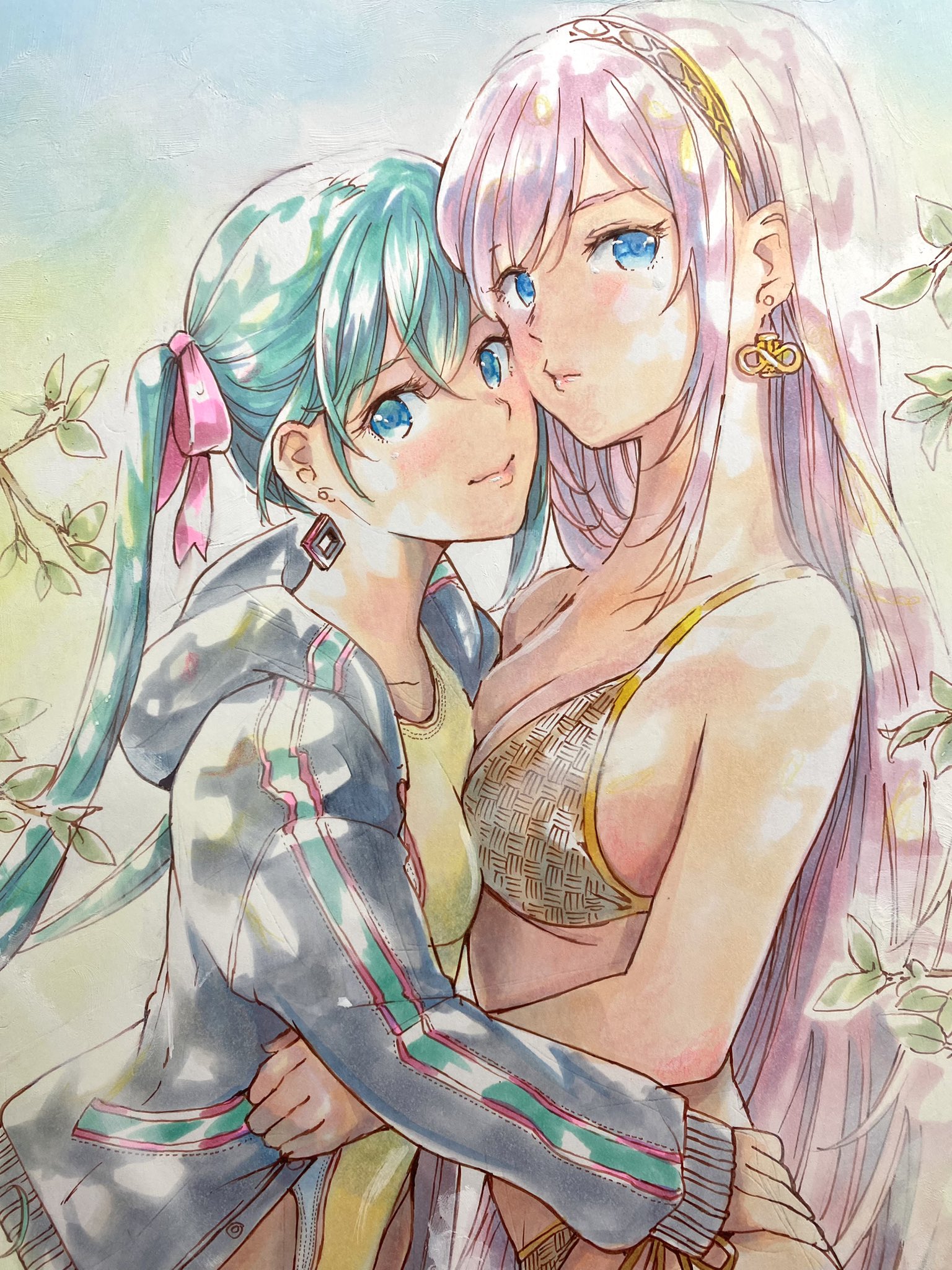 2girls aqua_eyes aqua_hair arms_around_waist bikini blue_eyes branch breast_press breasts cheek-to-cheek cleavage earrings female_focus hair_ribbon hatsune_miku heads_together highres hood hoodie hug jewelry leaf long_hair looking_at_viewer mayo_riyo megurine_luka multiple_girls one-piece_swimsuit pink_hair pink_ribbon ribbon string_bikini swimsuit twintails vocaloid yuri