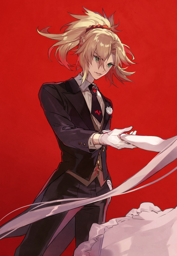 1girl 1other black_jacket black_necktie black_pants blonde_hair coattails collared_shirt cowboy_shot dress fate/grand_order fate_(series) formal_clothes gem gloves green_eyes grey_vest hair_between_eyes hand_in_pocket holding_hands itefu jacket looking_to_the_side medium_hair mordred_(fate) necktie pants parted_lips red_background red_gem red_scrunchie scrunchie shirt simple_background solo solo_focus suit tailcoat vest white_dress white_gloves white_shirt