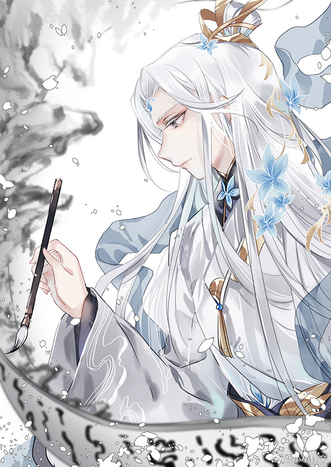 1boy black_eyes black_shirt blue_flower blue_shawl brooch calligraphy_brush chinese_clothes chinese_commentary closed_mouth curtained_hair falling_petals feisheng_cong_kaoshi_kaishi flower flower_brooch forehead_jewel from_side hagoromo hair_flower hair_ornament hanfu holding holding_calligraphy_brush holding_paintbrush ink long_hair long_sleeves male_focus paintbrush parted_bangs petals profile robe scroll shawl shirt sidelocks smile smoke solo tassel topknot upper_body watermark weibo_watermark white_background white_hair white_hanfu white_robe wide_sleeves writing xiao_guan_(headdress) xiao_xiao_zuowen