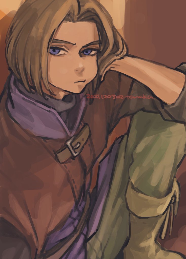 1boy black_shirt blue_eyes boots brown_hair brown_tunic closed_mouth commentary_request dated dragon_quest dragon_quest_xi from_above green_boots green_pants hand_in_own_hair hero_(dq11) hotaru1012 knee_up looking_at_viewer looking_to_the_side male_focus medium_hair pants parted_hair puffy_cheeks purple_tunic shirt sleeves_rolled_up solo tunic